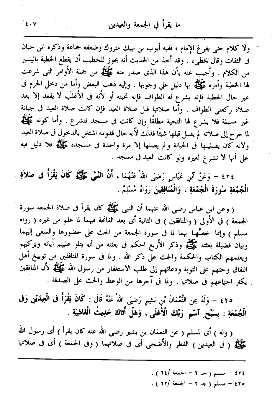 (424) - وَعَنْ ابْنِ عَبَّاسٍ - رَضِيَ اللَّهُ عَنْهُمَا -، أَنَّ «النَّبِيَّ - صَلَّى اللَّهُ عَلَيْهِ وَسَلَّمَ - كَانَ يَقْرَأُ فِي صَلَاةِ الْجُمُعَةِ سُورَةَ الْجُمُعَةِ، وَالْمُنَافِقِينَ» رَوَاهُ مُسْلِمٌ