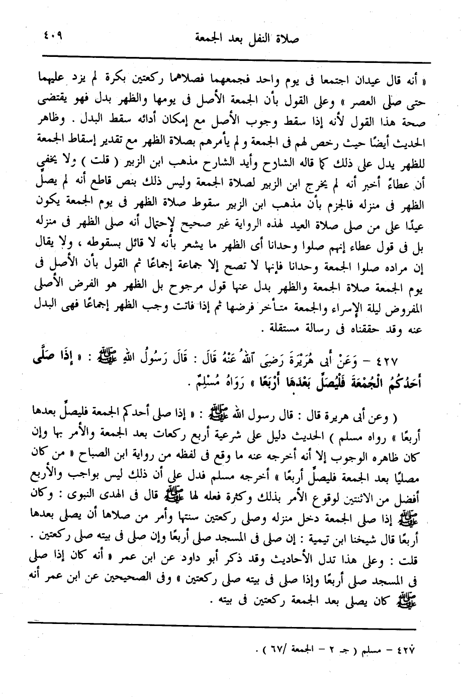 (427) - وَعَنْ أَبِي هُرَيْرَةَ - رَضِيَ اللَّهُ عَنْهُ - قَالَ: قَالَ رَسُولُ اللَّهِ - صَلَّى اللَّهُ عَلَيْهِ وَسَلَّمَ -: «إذَا صَلَّى أَحَدُكُمْ الْجُمُعَةَ فَلْيُصَلِّ بَعْدَهَا أَرْبَعًا» رَوَاهُ مُسْلِمٌ
