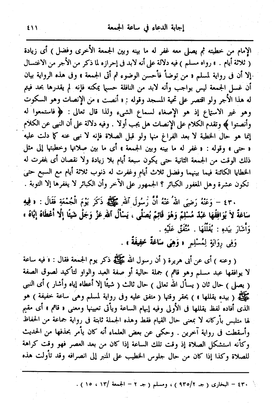 (430) - وَعَنْهُ - رَضِيَ اللَّهُ عَنْهُ - أَنَّ رَسُولَ اللَّهِ - صَلَّى اللَّهُ عَلَيْهِ وَسَلَّمَ - ذَكَرَ يَوْمَ الْجُمُعَةِ فَقَالَ: «فِيهِ سَاعَةٌ لَا يُوَافِقُهَا عَبْدٌ مُسْلِمٌ، وَهُوَ قَائِمٌ يُصَلِّي، يَسْأَلُ اللَّهَ - عَزَّ وَجَلَّ - شَيْئًا إلَّا أَعْطَاهُ إيَّاهُ، وَأَشَارَ بِيَدِهِ: يُقَلِّلُهَا» مُتَّفَقٌ عَلَيْهِ، وَفِي رِوَايَةٍ لِمُسْلِمٍ " وَهِيَ سَاعَةٌ خَفِيفَةٌ "