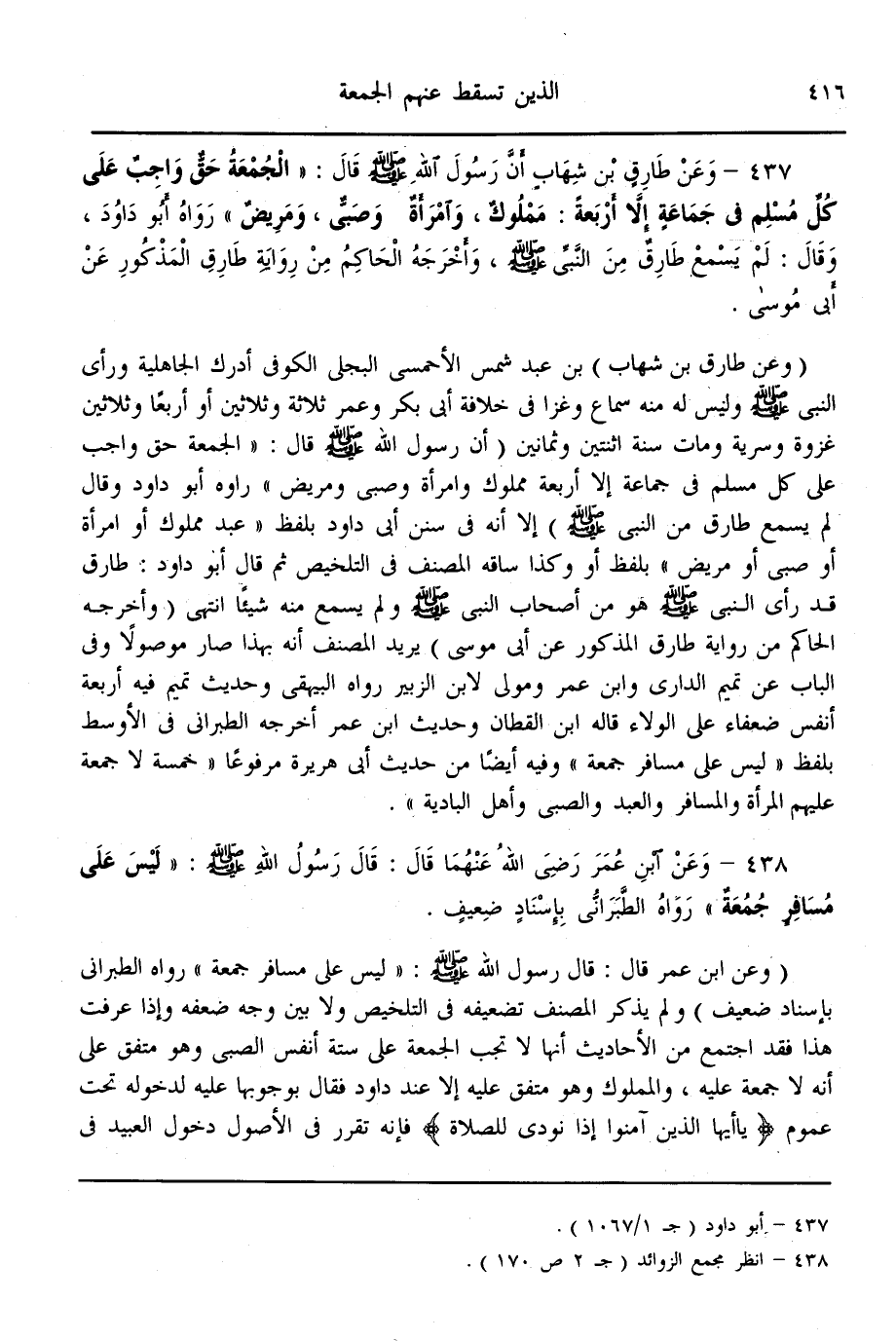 (437) - وَعَنْ طَارِقِ بْنِ شِهَابٍ أَنَّ رَسُولَ اللَّهِ - صَلَّى اللَّهُ عَلَيْهِ وَسَلَّمَ - قَالَ: «الْجُمُعَةُ حَقٌّ وَاجِبٌ عَلَى كُلِّ مُسْلِمٍ فِي جَمَاعَةٍ إلَّا أَرْبَعَةً: مَمْلُوكٌ وَامْرَأَةٌ وَصَبِيٌّ وَمَرِيضٌ» رَوَاهُ أَبُو دَاوُد، وَقَالَ: لَمْ يَسْمَعْ طَارِقٌ مِنْ النَّبِيِّ - صَلَّى اللَّهُ عَلَيْهِ وَسَلَّمَ -، وَأَخْرَجَهُ الْحَاكِمُ مِنْ رِوَايَةِ طَارِقٍ الْمَذْكُورِ عَنْ أَبِي مُوسَى.