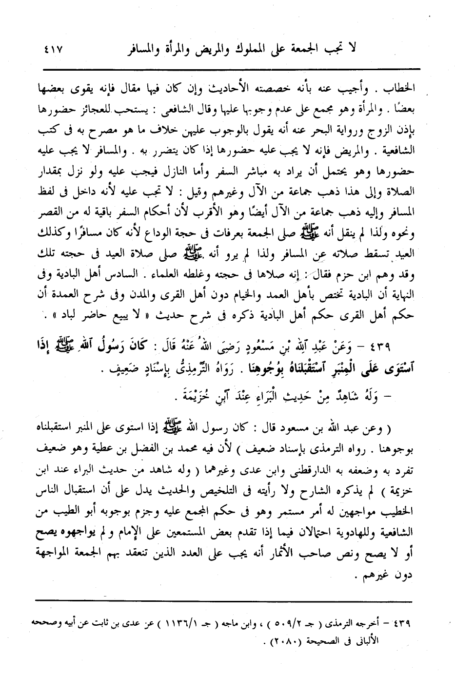 وَالْمُسَافِرُ لَا يَجِبُ عَلَيْهِ حُضُورُهَا، وَهُوَ يَحْتَمِلُ أَنْ يُرَادَ بِهِ مُبَاشِرُ السَّفَرِ، وَأَمَّا النَّازِلُ فَيَجِبُ عَلَيْهِ وَلَوْ نَزَلَ بِمِقْدَارِ الصَّلَاةِ، وَإِلَى هَذَا ذَهَبَ جَمَاعَةٌ مِنْ الْآلِ وَغَيْرِهِمْ، وَقِيلَ: لَا تَجِبُ عَلَيْهِ؛ لِأَنَّهُ دَاخِلٌ فِي لَفْظِ الْمُسَافِرِ، وَإِلَيْهِ ذَهَبَ جَمَاعَةٌ مِنْ الْآلِ أَيْضًا، وَهُوَ الْأَقْرَبُ؛ لِأَنَّ أَحْكَامَ السَّفَرِ بَاقِيَةٌ لَهُ مِنْ الْقَصْرِ وَنَحْوِهِ وَلِذَا لَمْ يُنْقَلْ أَنَّهُ - صَلَّى اللَّهُ عَلَيْهِ وَسَلَّمَ - صَلَّى الْجُمُعَةَ بِعَرَفَاتٍ فِي حَجَّةِ الْوَدَاعِ؛ لِأَنَّهُ كَانَ مُسَافِرًا وَكَذَلِكَ الْعِيدُ تَسْقُطُ صَلَاتُهُ عَنْ الْمُسَافِرِ وَلِذَا لَمْ يُرْوَ أَنَّهُ - صَلَّى اللَّهُ عَلَيْهِ وَسَلَّمَ - صَلَّى صَلَاةَ الْعِيدِ فِي حَجَّتِهِ تِلْكَ، وَقَدْ وَهَمَ ابْنُ حَزْمٍ فَقَالَ: إنَّهُ صَلَّاهَا فِي حَجَّتِهِ وَغَلَّطَهُ الْعُلَمَاءُ.