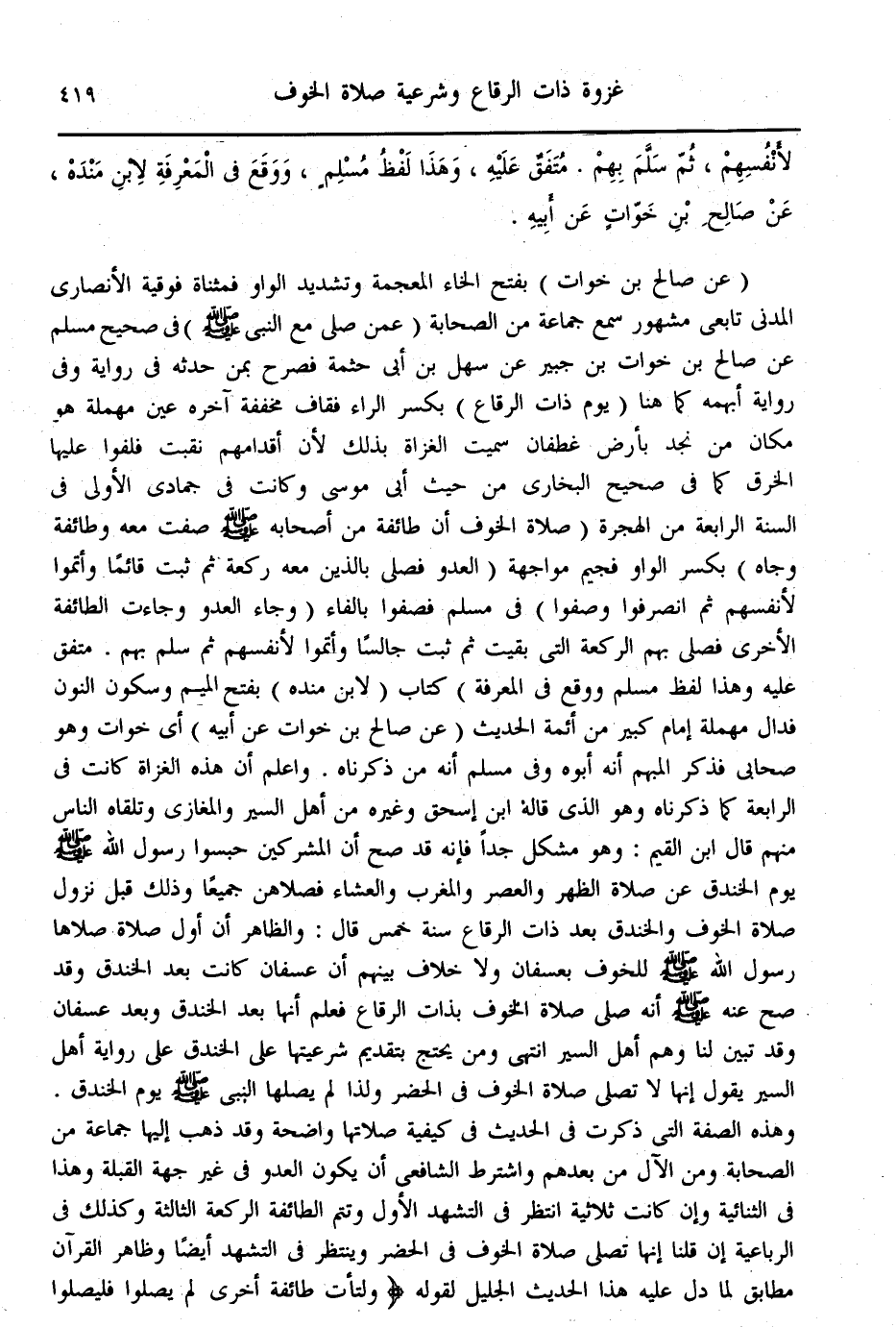 (عَنْ صَالِحِ بْنِ خَوَّاتٍ) بِفَتْحِ الْخَاءِ الْمُعْجَمَةِ وَتَشْدِيدِ الْوَاوِ فَمُثَنَّاةٌ فَوْقِيَّةٌ الْأَنْصَارِيُّ الْمَدَنِيُّ تَابِعِيٌّ مَشْهُورٌ سَمِعَ جَمَاعَةً مِنْ الصَّحَابَةِ (عَمَّنْ صَلَّى مَعَ النَّبِيِّ - صَلَّى اللَّهُ عَلَيْهِ وَسَلَّمَ -) فِي صَحِيحِ مُسْلِمٍ عَنْ صَالِحِ بْنِ خَوَّاتِ بْنِ جُبَيْرٍ عَنْ سَهْلِ بْنِ أَبِي حَثْمَةَ فَصَرَّحَ بِمَنْ حَدَّثَهُ فِي الرِّوَايَةِ، وَفِي رِوَايَةٍ أَبْهَمَهُ كَمَا هُنَا (يَوْمَ ذَاتِ الرِّقَاعِ) بِكَسْرِ الرَّاءِ فَقَافٌ مُخَفَّفَةٌ آخِرُهُ عَيْنٌ مُهْمَلَةٌ هُوَ مَكَانٌ مِنْ نَجْدٍ بِأَرْضِ غَطَفَانَ سُمِّيَتْ الْغَزَاةُ بِذَلِكَ؛ لِأَنَّ أَقْدَامَهُمْ نَقِبَتْ فَلَفُّوا عَلَيْهَا الْخِرَقَ كَمَا فِي صَحِيحِ الْبُخَارِيِّ مِنْ حَدِيثِ أَبِي مُوسَى وَكَانَتْ فِي جُمَادَى الْأُولَى فِي السَّنَةِ الرَّابِعَةِ مِنْ الْهِجْرَةِ «صَلَاةُ الْخَوْفِ أَنَّ طَائِفَةً مِنْ أَصْحَابِهِ - صَلَّى اللَّهُ عَلَيْهِ وَسَلَّمَ - صَفَّتْ مَعَهُ وَطَائِفَةً وِجَاهَ» بِكَسْرِ الْوَاوِ فَجِيمٌ مُوَاجِهَةَ (الْعَدُوِّ فَصَلَّى بِاَلَّذِينَ مَعَهُ رَكْعَةً ثُمَّ ثَبَتَ قَائِمًا، وَأَتَمُّوا؛ لِأَنْفُسِهِمْ ثُمَّ انْصَرَفُوا وَصَفُّوا) فِي مُسْلِمٍ فَصَفُّوا بِالْفَاءِ (وِجَاهَ الْعَدُوِّ وَجَاءَتْ الطَّائِفَةُ الْأُخْرَى فَصَلَّى بِهِمْ الرَّكْعَةَ الَّتِي بَقِيَتْ ثُمَّ ثَبَتَ جَالِسًا، وَأَتَمُّوا؛ لِأَنْفُسِهِمْ ثُمَّ سَلَّمَ بِهِمْ. مُتَّفَقٌ عَلَيْهِ وَهَذَا لَفْظُ مُسْلِمٍ وَوَقَعَ فِي الْمَعْرِفَةِ) كِتَابٌ لِابْنِ مَنْدَهْ) بِفَتْحِ الْمِيمِ وَسُكُونِ النُّونِ فَدَالٌ مُهْمَلَةٌ إمَامٌ كَبِيرٌ مِنْ أَئِمَّةِ الْحَدِيثِ (عَنْ صَالِحِ بْنِ خَوَّاتٍ عَنْ أَبِيهِ) أَيْ خَوَّاتٌ، وَهُوَ صَحَابِيٌّ فَذَكَرَ الْمُبْهَمَ أَنَّهُ أَبُوهُ، وَفِي مُسْلِمٍ أَنَّهُ مَنْ ذَكَرْنَاهُ.