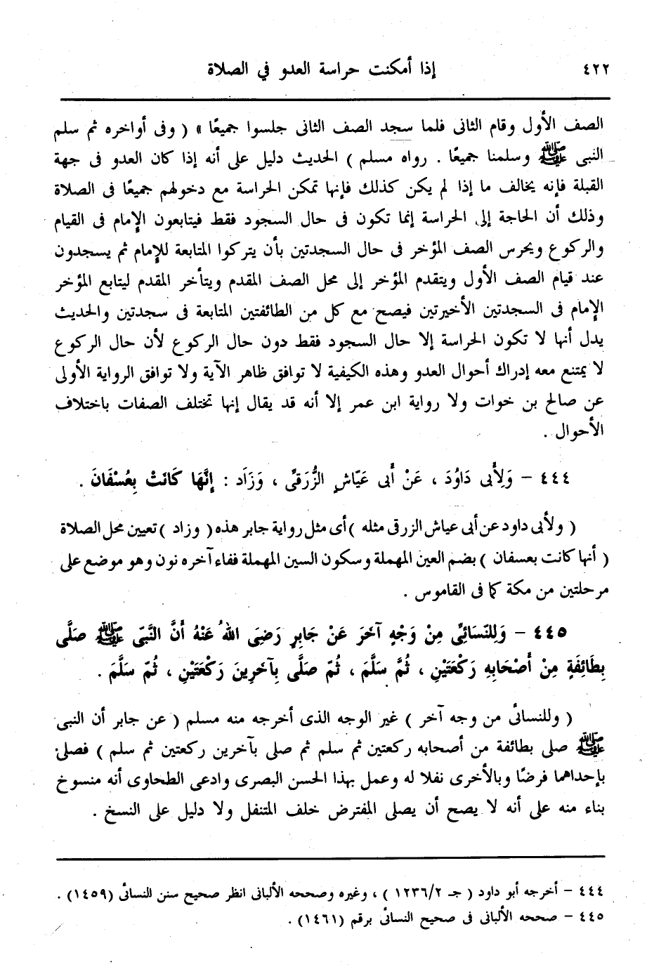 (445) - وَلِلنَّسَائِيِّ مِنْ وَجْهٍ آخَرَ عَنْ جَابِرٍ - رَضِيَ اللَّهُ عَنْهُ - أَنَّ «النَّبِيَّ - صَلَّى اللَّهُ عَلَيْهِ وَسَلَّمَ - صَلَّى بِطَائِفَةٍ مِنْ أَصْحَابِهِ رَكْعَتَيْنِ، ثُمَّ سَلَّمَ، ثُمَّ صَلَّى بِآخَرِينَ رَكْعَتَيْنِ، ثُمَّ سَلَّمَ»