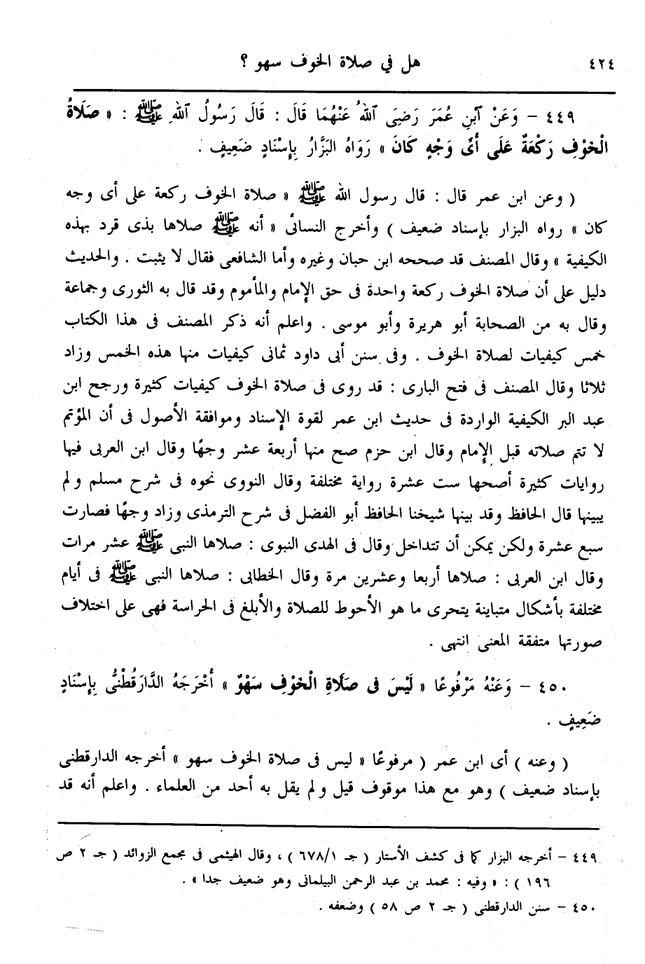 (450) - وَعَنْهُ مَرْفُوعًا «لَيْسَ فِي صَلَاةِ الْخَوْفِ سَهْوٌ» أَخْرَجَهُ الدَّارَقُطْنِيُّ بِإِسْنَادٍ ضَعِيفٍ