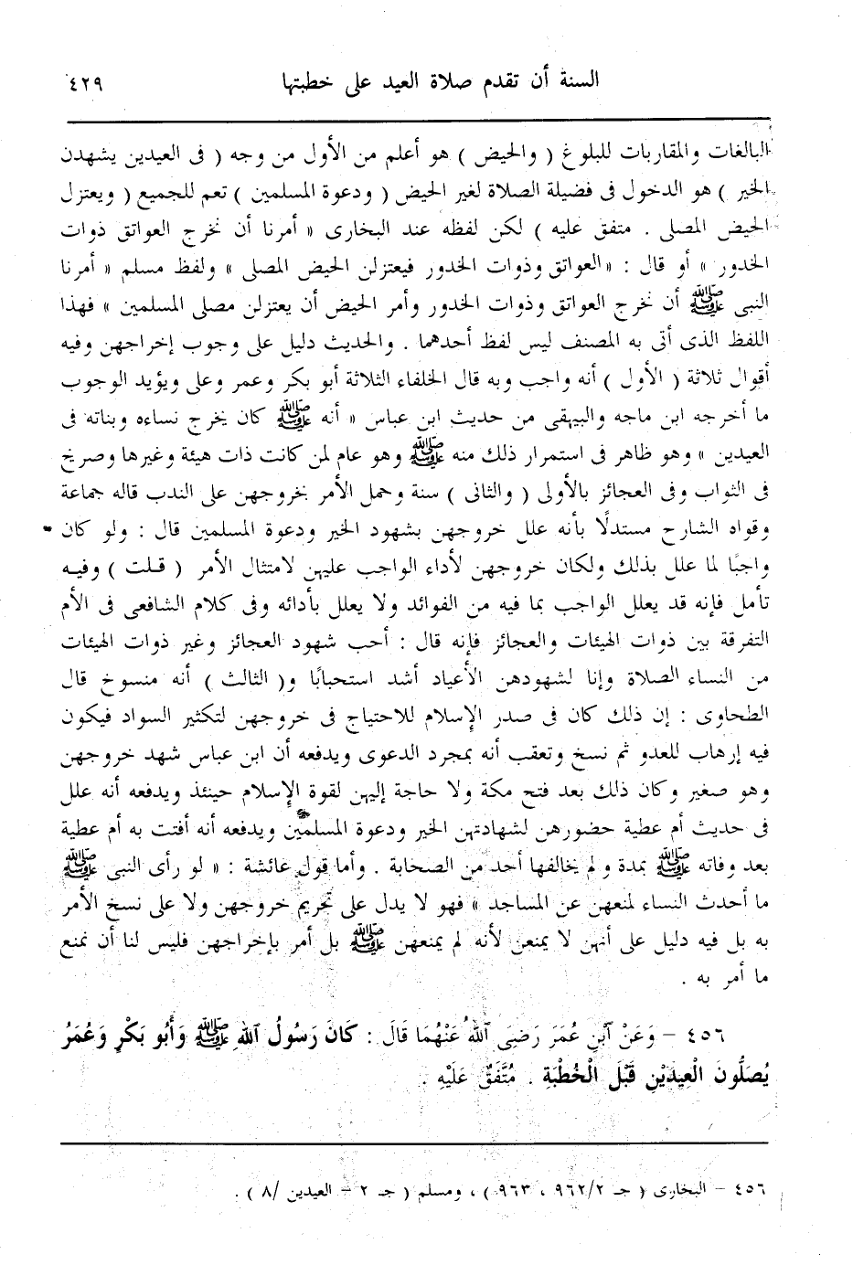 (456) - وَعَنْ ابْنِ عُمَرَ - رَضِيَ اللَّهُ عَنْهُمَا - قَالَ: «كَانَ رَسُولُ اللَّهِ - صَلَّى اللَّهُ عَلَيْهِ وَسَلَّمَ -، وَأَبُو بَكْرٍ وَعُمَرُ يُصَلُّونَ الْعِيدَيْنِ قَبْلَ الْخُطْبَةِ» . مُتَّفَقٌ عَلَيْهِ.