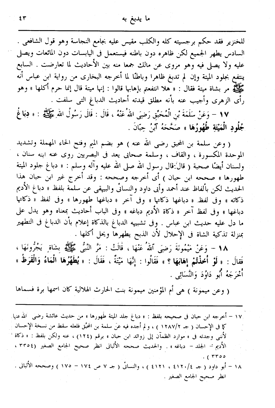 (17) - وَعَنْ سَلَمَةَ بْنِ الْمُحَبِّقِ - رَضِيَ اللَّهُ عَنْهُ - قَالَ: قَالَ رَسُولُ اللَّهِ - صَلَّى اللَّهُ عَلَيْهِ وَسَلَّمَ - «دِبَاغُ جُلُودِ الْمَيْتَةِ طَهُورُهَا» صَحَّحَهُ ابْنُ حِبَّانَ.
