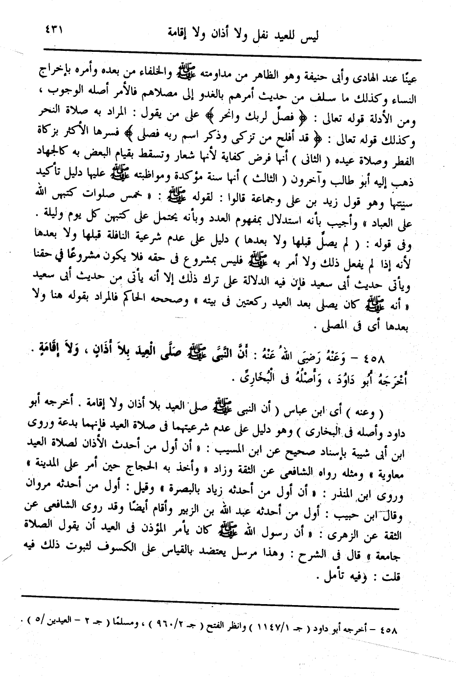 (458) - وَعَنْهُ - رَضِيَ اللَّهُ عَنْهُ -: «أَنَّ النَّبِيَّ - صَلَّى اللَّهُ عَلَيْهِ وَسَلَّمَ - صَلَّى الْعِيدَ بِلَا أَذَانٍ، وَلَا إقَامَةٍ» . أَخْرَجَهُ أَبُو دَاوُد، وَأَصْلُهُ فِي الْبُخَارِيِّ
