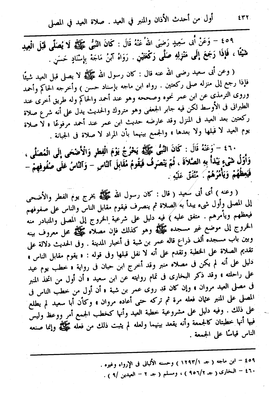 (459) - وَعَنْ أَبِي سَعِيدٍ - رَضِيَ اللَّهُ عَنْهُ - قَالَ: «كَانَ النَّبِيُّ - صَلَّى اللَّهُ عَلَيْهِ وَسَلَّمَ - لَا يُصَلِّي قَبْلَ الْعِيدِ شَيْئًا، فَإِذَا رَجَعَ إلَى مَنْزِلِهِ صَلَّى رَكْعَتَيْنِ» . رَوَاهُ ابْنُ مَاجَهْ بِإِسْنَادٍ حَسَنٍ