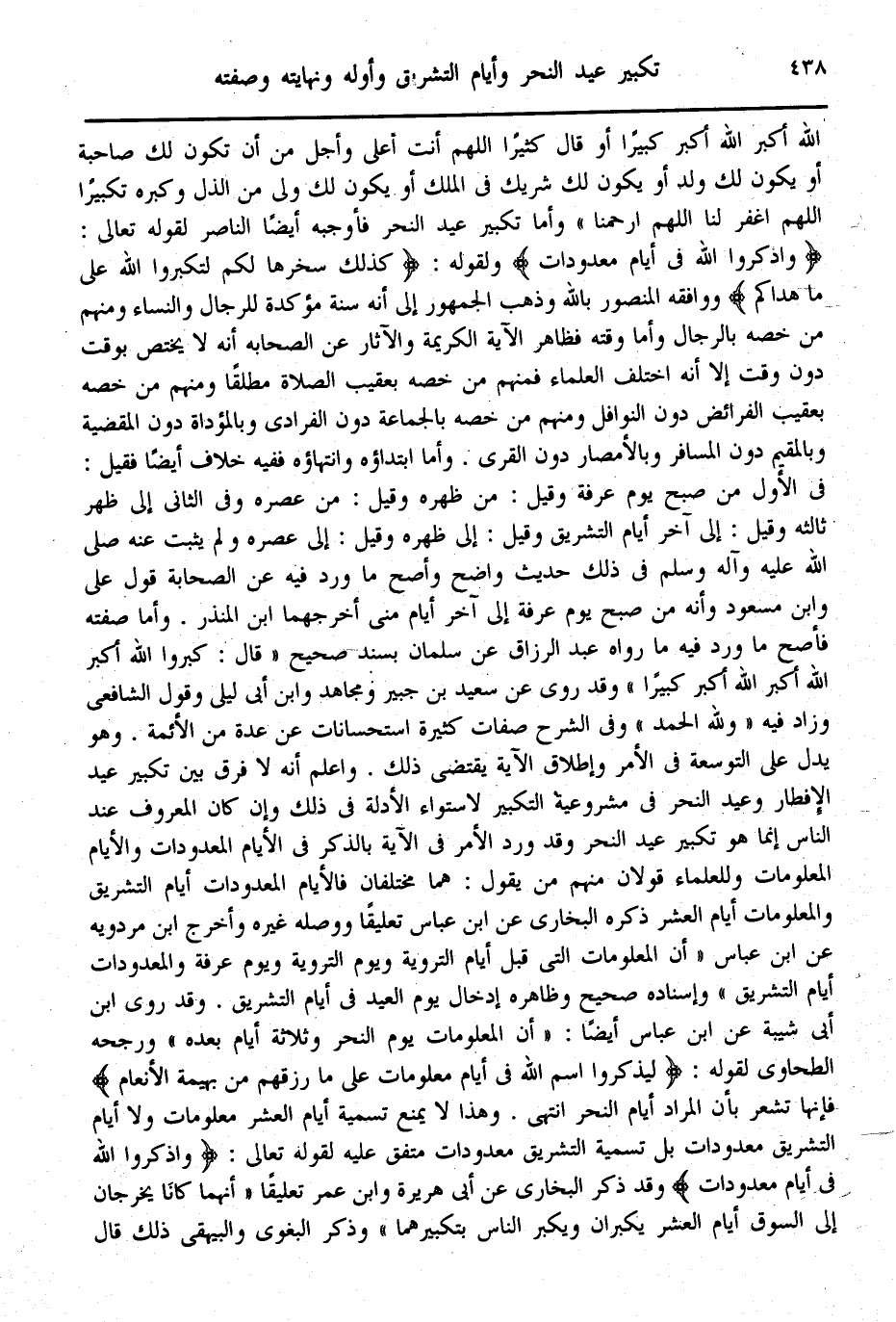 وَأَمَّا تَكْبِيرُ عِيدِ النَّحْرِ فَأَوْجَبَهُ أَيْضًا النَّاصِرُ لِقَوْلِهِ تَعَالَى: {وَاذْكُرُوا اللَّهَ فِي أَيَّامٍ مَعْدُودَاتٍ} [البقرة: 203] وَلِقَوْلِهِ: {كَذَلِكَ سَخَّرَهَا لَكُمْ لِتُكَبِّرُوا اللَّهَ عَلَى مَا هَدَاكُمْ} [الحج: 37] وَوَافَقَهُ الْمَنْصُورُ بِاَللَّهِ وَذَهَبَ الْجُمْهُورُ إلَى أَنَّهُ سُنَّةٌ مُؤَكَّدَةٌ لِلرِّجَالِ وَالنِّسَاءِ وَمِنْهُمْ مَنْ خَصَّهُ بِالرِّجَالِ، وَأَمَّا وَقْتُهُ فَظَاهِرُ الْآيَةِ الْكَرِيمَةِ، وَالْآثَارُ عَنْ الصَّحَابَةِ أَنَّهُ لَا يَخْتَصُّ بِوَقْتٍ دُونَ وَقْتٍ إلَّا أَنَّهُ اخْتَلَفَ الْعُلَمَاءُ فَمِنْهُمْ مَنْ خَصَّهُ بِعَقِيبِ الصَّلَاةِ مُطْلَقًا وَمِنْهُمْ مَنْ خَصَّهُ بِعَقِيبِ الْفَرَائِضِ دُونَ النَّوَافِلِ وَمِنْهُمْ مَنْ خَصَّهُ بِالْجَمَاعَةِ دُونَ الْفُرَادَى وَبِالْمُؤَدَّاةِ دُونَ الْمَقْضِيَّةِ وَبِالْمُقِيمِ دُونَ الْمُسَافِرِ وَبِالْأَمْصَارِ دُونَ الْقُرَى.
