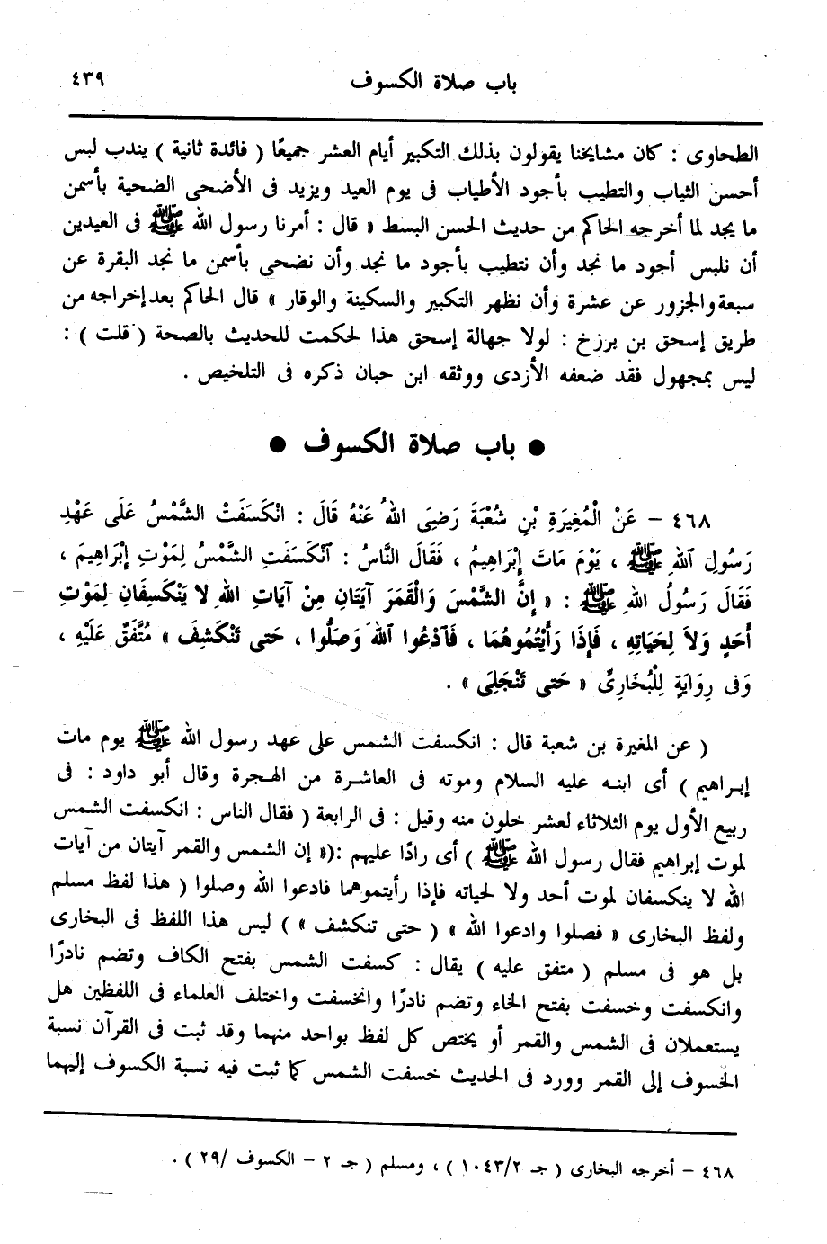 (468) - بَابُ صَلَاةِ الْكُسُوفِ عَنْ الْمُغِيرَةِ بْنِ شُعْبَةَ - رَضِيَ اللَّهُ عَنْهُ - قَالَ: «انْكَسَفَتْ الشَّمْسُ عَلَى عَهْدِ رَسُولِ اللَّهِ - صَلَّى اللَّهُ عَلَيْهِ وَسَلَّمَ -، يَوْمَ مَاتَ إبْرَاهِيمُ، فَقَالَ النَّاسُ: انْكَسَفَتْ الشَّمْسُ لِمَوْتِ إبْرَاهِيمَ، فَقَالَ رَسُولُ اللَّهِ - صَلَّى اللَّهُ عَلَيْهِ وَسَلَّمَ -: إنَّ الشَّمْسَ وَالْقَمَرَ آيَتَانِ مِنْ آيَاتِ اللَّهِ لَا يَنْكَسِفَانِ لِمَوْتِ أَحَدٍ وَلَا لِحَيَاتِهِ، فَإِذَا رَأَيْتُمُوهُمَا، فَادْعُوا اللَّهَ وَصَلُّوا حَتَّى تَنْكَشِفَ» مُتَّفَقٌ عَلَيْهِ، وَفِي رِوَايَةٍ لِلْبُخَارِيِّ " حَتَّى تَنْجَلِيَ "