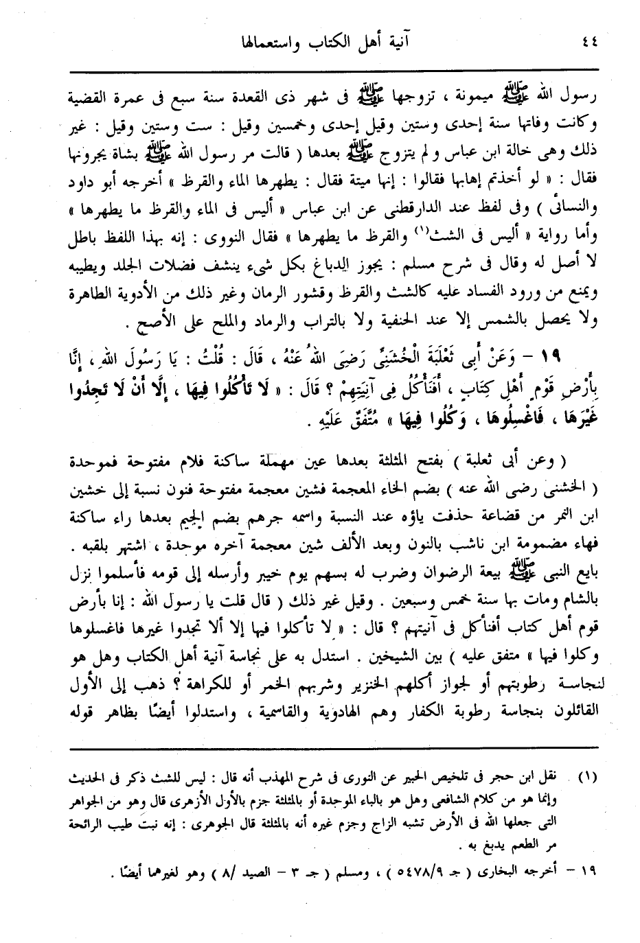 (19) - وَعَنْ أَبِي ثَعْلَبَةَ الْخُشَنِيِّ - رَضِيَ اللَّهُ عَنْهُ -، قَالَ: «قُلْت: يَا رَسُولَ اللَّهِ، إنَّا بِأَرْضِ قَوْمٍ أَهْلِ كِتَابٍ، أَفَنَأْكُلُ فِي آنِيَتِهِمْ؟ قَالَ: لَا تَأْكُلُوا فِيهَا، إلَّا أَنْ لَا تَجِدُوا غَيْرَهَا، فَاغْسِلُوهَا، وَكُلُوا فِيهَا» مُتَّفَقٌ عَلَيْهِ.