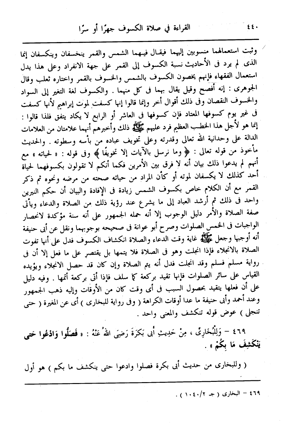 (469) - وَلِلْبُخَارِيِّ مِنْ حَدِيثِ أَبِي بَكْرَةَ - رَضِيَ اللَّهُ عَنْهُ -: «فَصَلُّوا وَادْعُوا حَتَّى يَنْكَشِفَ مَا بِكُمْ»