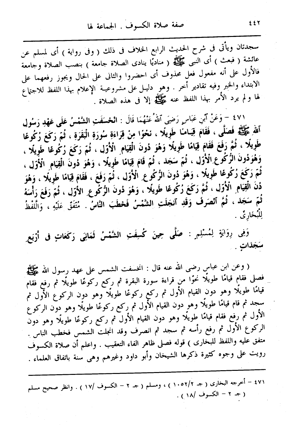 (471) - (وَعَنْ ابْنِ عَبَّاسٍ - رَضِيَ اللَّهُ عَنْهُ - قَالَ: «انْخَسَفَتْ الشَّمْسُ عَلَى عَهْدِ رَسُولِ اللَّهِ - صَلَّى اللَّهُ عَلَيْهِ وَسَلَّمَ - فَصَلَّى فَقَامَ قِيَامًا طَوِيلًا نَحْوًا مِنْ قِرَاءَةِ سُورَةِ الْبَقَرَةِ ثُمَّ رَكَعَ رُكُوعًا طَوِيلًا ثُمَّ رَفَعَ فَقَامَ قِيَامًا طَوِيلًا، وَهُوَ دُونَ الْقِيَامِ الْأَوَّلِ ثُمَّ رَكَعَ رُكُوعًا طَوِيلًا، وَهُوَ دُونَ الرُّكُوعِ الْأَوَّلِ ثُمَّ سَجَدَ ثُمَّ قَامَ قِيَامًا طَوِيلًا، وَهُوَ دُونَ الْقِيَامِ الْأَوَّلِ ثُمَّ رَكَعَ رُكُوعًا طَوِيلًا، وَهُوَ دُونَ الرُّكُوعِ الْأَوَّلِ ثُمَّ رَفَعَ فَقَامَ قِيَامًا طَوِيلًا، وَهُوَ دُونَ الْقِيَامِ الْأَوَّلِ ثُمَّ رَكَعَ رُكُوعًا طَوِيلًا، وَهُوَ دُونَ الرُّكُوعِ الْأَوَّلِ ثُمَّ رَفَعَ رَأْسَهُ ثُمَّ سَجَدَ ثُمَّ انْصَرَفَ، وَقَدْ انْجَلَتْ الشَّمْسُ فَخَطَبَ النَّاسَ» . مُتَّفَقٌ عَلَيْهِ وَاللَّفْظُ لِلْبُخَارِيِّ)