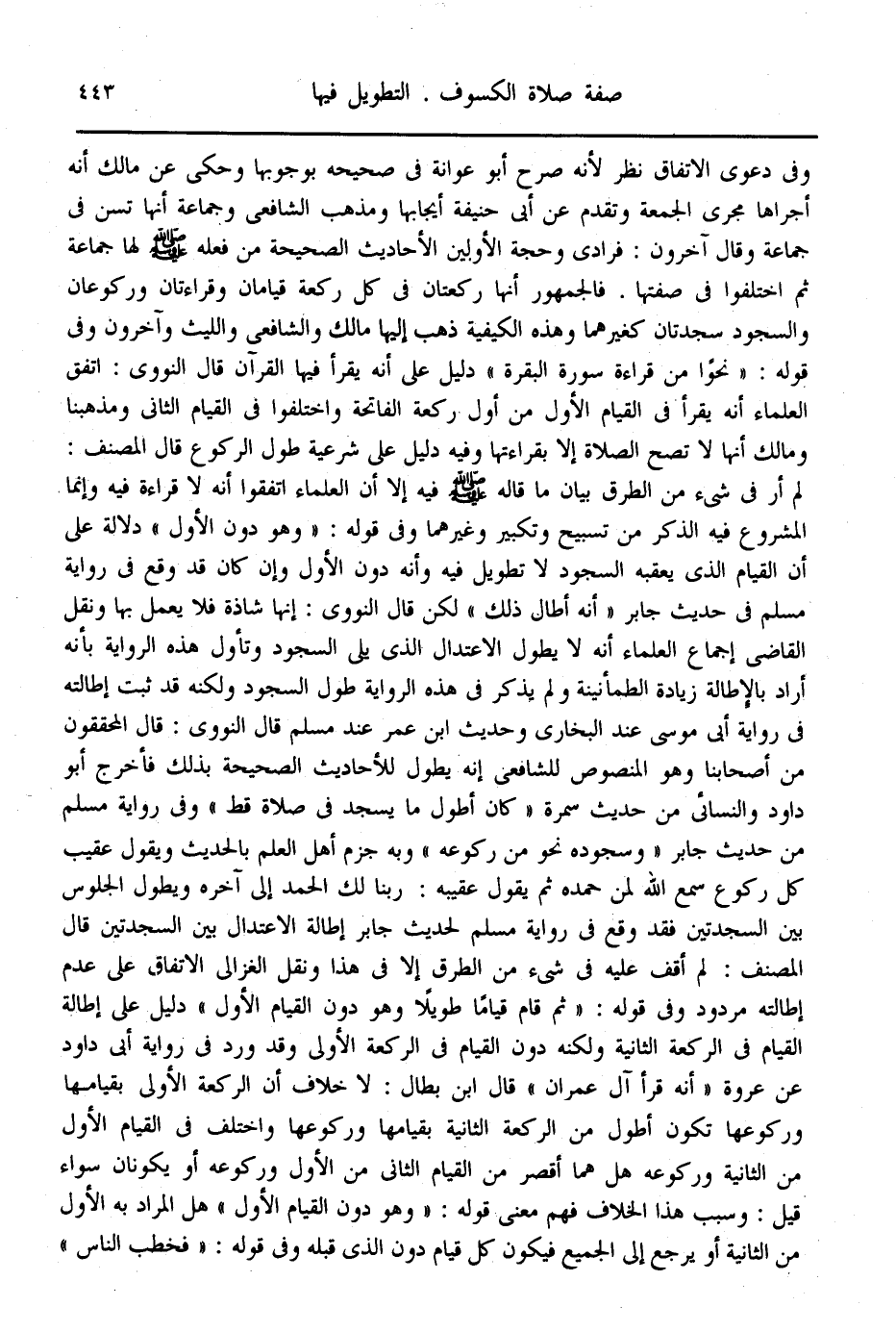 فَالْجُمْهُورُ أَنَّهَا رَكْعَتَانِ فِي كُلِّ رَكْعَةٍ قِيَامَانِ وَقِرَاءَتَانِ وَرُكُوعَانِ وَالسُّجُودُ سَجْدَتَانِ كَغَيْرِهِمَا، وَهَذِهِ الْكَيْفِيَّةُ ذَهَبَ إلَيْهَا مَالِكٌ وَالشَّافِعِيُّ وَاللَّيْثُ وَآخَرُونَ وَفِي قَوْلِهِ: " نَحْوًا مِنْ قِرَاءَةِ سُورَةِ الْبَقَرَةِ " دَلِيلٌ عَلَى أَنَّهُ يَقْرَأُ فِيهَا الْقُرْآنَ قَالَ النَّوَوِيُّ: اتَّفَقَ الْعُلَمَاءُ أَنَّهُ يَقْرَأُ فِي الْقِيَامِ الْأَوَّلِ مِنْ أَوَّلِ رَكْعَةِ الْفَاتِحَةِ وَاخْتَلَفُوا فِي الْقِيَامِ الثَّانِي، وَمَذْهَبُنَا وَمَالِكٌ أَنَّهَا لَا تَصِحُّ الصَّلَاةُ إلَّا بِقِرَاءَتِهَا، وَفِيهِ دَلِيلٌ عَلَى شَرْعِيَّةِ طُولِ الرُّكُوعِ قَالَ الْمُصَنِّفُ: لَمْ أَرَ فِي شَيْءٍ مِنْ الطُّرُقِ بَيَانَ مَا قَالَهُ - صَلَّى اللَّهُ عَلَيْهِ وَسَلَّمَ - فِيهِ إلَّا أَنَّ الْعُلَمَاءَ اتَّفَقُوا أَنَّهُ لَا قِرَاءَةَ فِيهِ، وَإِنَّمَا الْمَشْرُوعُ فِيهِ الذِّكْرُ مِنْ تَسْبِيحٍ وَتَكْبِيرٍ وَغَيْرِهِمَا وَفِي قَوْلِهِ: " وَهُوَ دُونَ الْأَوَّلِ " دَلَالَةٌ عَلَى أَنَّ الْقِيَامَ الَّذِي يَعْقُبُهُ السُّجُودُ لَا تَطْوِيلَ فِيهِ، وَأَنَّهُ دُونَ الْأَوَّلِ، وَإِنْ كَانَ قَدْ، وَقَعَ فِي رِوَايَةِ مُسْلِمٍ فِي حَدِيثِ جَابِرٍ " أَنَّهُ أَطَالَ ذَلِكَ " لَكِنْ قَالَ النَّوَوِيُّ: إنَّهَا شَاذَّةٌ فَلَا يُعْمَلُ بِهَا وَنَقَلَ الْقَاضِي إجْمَاعَ الْعُلَمَاءِ أَنَّهُ لَا يُطَوِّلُ الِاعْتِدَالَ الَّذِي يَلِي السُّجُودَ وَتَأَوَّلَ هَذِهِ الرِّوَايَةَ بِأَنَّهُ أَرَادَ بِالْإِطَالَةِ زِيَادَةَ الطُّمَأْنِينَةِ وَلَمْ يَذْكُرْ فِي هَذِهِ الرِّوَايَةِ طُولَ السُّجُودِ وَلَكِنَّهُ قَدْ ثَبَتَ إطَالَتُهُ فِي رِوَايَةِ أَبِي مُوسَى عِنْدَ الْبُخَارِيِّ وَحَدِيثُ ابْنِ عُمَرَ عِنْدَ مُسْلِمٍ قَالَ النَّوَوِيُّ: قَالَ الْمُحَقِّقُونَ مِنْ أَصْحَابِنَا، وَهُوَ الْمَنْصُوصُ لِلشَّافِعِيِّ إنَّهُ يُطَوِّلُ لِلْأَحَادِيثِ الصَّحِيحَةِ بِذَلِكَ فَأَخْرَجَ أَبُو دَاوُد وَالنَّسَائِيُّ مِنْ حَدِيثِ سَمُرَةَ " كَانَ أَطْوَلُ مَا يَسْجُدُ فِي صَلَاةٍ قَطُّ " وَفِي رِوَايَةِ مُسْلِمٍ مِنْ حَدِيثِ جَابِرٍ " وَسُجُودُهُ نَحْوُ مِنْ رُكُوعِهِ " وَبِهِ جَزَمَ أَهْلُ الْعِلْمِ بِالْحَدِيثِ وَيَقُولُ عَقِيبَ كُلِّ رُكُوعٍ سَمِعَ اللَّهُ لِمَنْ حَمِدَهُ ثُمَّ يَقُولُ عَقِيبَهُ: رَبَّنَا لَك الْحَمْدُ إلَى آخِرِهِ وَيُطَوِّلُ الْجُلُوسَ بَيْنَ السَّجْدَتَيْنِ فَقَدْ، وَقَعَ فِي رِوَايَةِ مُسْلِمٍ لِحَدِيثِ جَابِرٍ «إطَالَةُ الِاعْتِدَالِ بَيْنَ السَّجْدَتَيْنِ» قَالَ الْمُصَنِّفُ: لَمْ أَقِفْ عَلَيْهِ فِي شَيْءٍ مِنْ الطُّرُقِ إلَّا فِي هَذَا وَنَقَلَ الْغَزَالِيُّ الِاتِّفَاقَ عَلَى عَدَمِ إطَالَتِهِ مَرْدُودٌ وَفِي قَوْلِهِ: " ثُمَّ قَامَ قِيَامًا طَوِيلًا، وَهُوَ دُونَ الْقِيَامِ الْأَوَّلِ " دَلِيلٌ عَلَى إطَالَةِ الْقِيَامِ فِي الرَّكْعَةِ الثَّانِيَةِ وَلَكِنَّهُ دُونَ الْقِيَامِ فِي الرَّكْعَةِ الْأُولَى، وَقَدْ وَرَدَ فِي رِوَايَةِ أَبِي دَاوُد عَنْ عُرْوَةَ " أَنَّهُ قَرَأَ آلَ عِمْرَانَ " قَالَ ابْنُ بَطَّالٍ: لَا خِلَافَ أَنَّ الرَّكْعَةَ الْأُولَى بِقِيَامِهَا وَرُكُوعِهَا تَكُونُ أَطْوَلَ مِنْ الرَّكْعَةِ الثَّانِيَةِ بِقِيَامِهَا وَرُكُوعِهَا وَاخْتُلِفَ فِي الْقِيَامِ الْأَوَّلِ مِنْ الثَّانِيَةِ وَرُكُوعِهِ هَلْ هُمَا أَقْصَرُ مِنْ الْقِيَامِ الثَّانِي مِنْ الْأَوَّلِ وَرُكُوعِهِ أَوْ يَكُونَانِ سَوَاءً قِيلَ: وَسَبَبُ هَذَا الْخِلَافِ فَهْمُ مَعْنَى قَوْلِهِ: " وَهُوَ دُونَ الْقِيَامِ الْأَوَّلِ " هَلْ الْمُرَادُ بِهِ الْأَوَّلُ مِنْ الثَّانِيَةِ أَوْ يَرْجِعُ إلَى الْجَمِيعِ فَيَكُونُ كُل