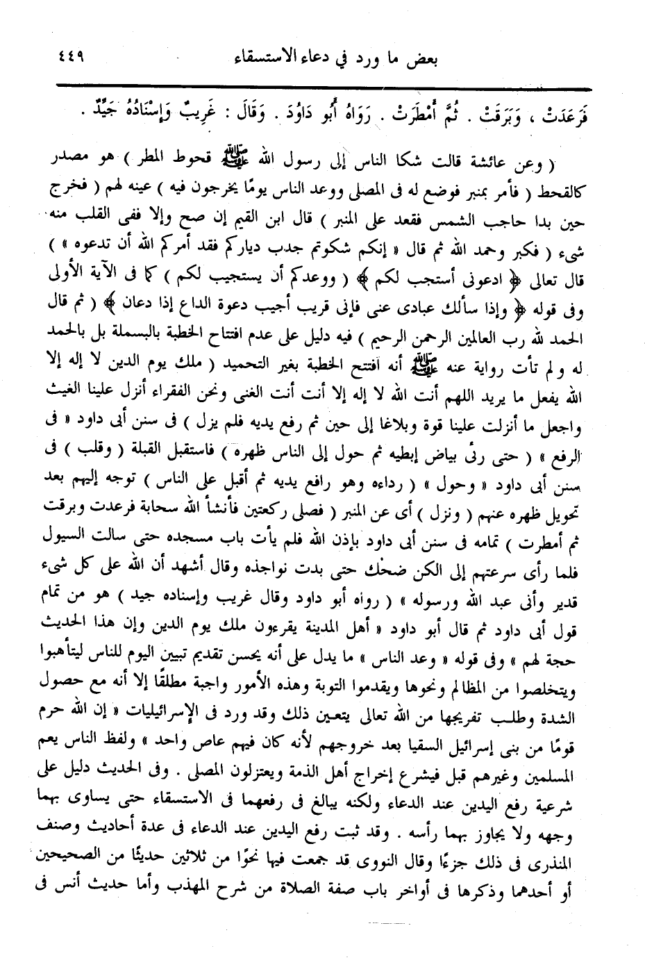 (وَعَنْ عَائِشَةَ قَالَتْ: شَكَا النَّاسُ إلَى رَسُولِ اللَّهِ - صَلَّى اللَّهُ عَلَيْهِ وَسَلَّمَ - قُحُوطَ الْمَطَرِ) هُوَ مَصْدَرٌ كَالْقَحْطِ (فَأَمَرَ بِمِنْبَرٍ فَوُضِعَ لَهُ فِي الْمُصَلَّى وَوَعَدَ النَّاسَ يَوْمًا يَخْرُجُونَ فِيهِ) عَيَّنَهُ لَهُمْ (فَخَرَجَ حِينَ بَدَا حَاجِبُ الشَّمْسِ فَقَعَدَ عَلَى الْمِنْبَرِ) قَالَ ابْنُ الْقَيِّمِ إنْ صَحَّ، وَإِلَّا فَفِي الْقَلْبِ مِنْهُ شَيْءٌ «فَكَبَّرَ وَحَمِدَ اللَّهَ ثُمَّ قَالَ إنَّكُمْ شَكَوْتُمْ جَدْبَ دِيَارِكُمْ فَقَدْ أَمَرَكُمْ اللَّهُ أَنْ تَدْعُوهُ» قَالَ تَعَالَى {ادْعُونِي أَسْتَجِبْ لَكُمْ} [غافر: 60] (وَوَعَدَكُمْ أَنْ يَسْتَجِيبَ لَكُمْ) كَمَا فِي الْآيَةِ الْأُولَى وَفِي قَوْلِهِ {وَإِذَا سَأَلَكَ عِبَادِي عَنِّي فَإِنِّي قَرِيبٌ أُجِيبُ دَعْوَةَ الدَّاعِ إِذَا دَعَانِ} [البقرة: 186] ثُمَّ قَالَ {الْحَمْدُ لِلَّهِ رَبِّ الْعَالَمِينَ} [الفاتحة: 2] {الرَّحْمَنِ الرَّحِيمِ} [الفاتحة: 3] فِيهِ دَلِيلٌ عَلَى عَدَمِ افْتِتَاحِ الْخُطْبَةِ بِالْبَسْمَلَةِ بَلْ بِالْحَمْدِ لَهُ وَلَمْ تَأْتِ رِوَايَةٌ عَنْهُ - صَلَّى اللَّهُ عَلَيْهِ وَسَلَّمَ - أَنَّهُ افْتَتَحَ الْخُطْبَةَ بِغَيْرِ التَّحْمِيدِ «مَلِكِ يَوْمِ الدِّينِ لَا إلَهَ إلَّا اللَّهُ يَفْعَلُ مَا يُرِيدُ اللَّهُمَّ أَنْتَ اللَّهُ لَا إلَهَ إلَّا أَنْتَ أَنْتَ الْغَنِيُّ وَنَحْنُ الْفُقَرَاءُ أَنْزِلْ عَلَيْنَا الْغَيْثَ وَاجْعَلْ مَا أَنْزَلْت عَلَيْنَا قُوَّةً وَبَلَاغًا إلَى حِينٍ ثُمَّ رَفَعَ يَدَيْهِ فَلَمْ يَزَلْ» فِي سُنَنِ أَبِي دَاوُد " فِي الرَّفْعِ " (حَتَّى رُئِيَ بَيَاضُ إبْطَيْهِ ثُمَّ حَوَّلَ إلَى النَّاسِ ظَهْرَهُ) فَاسْتَقْبَلَ الْقِبْلَةَ (وَقَلَبَ) فِي سُنَنِ أَبِي دَاوُد " وَحَوَّلَ " (رِدَاءَهُ، وَهُوَ رَافِعٌ يَدَيْهِ ثُمَّ أَقْبَلَ عَلَى النَّاسِ) تَوَجَّهَ إلَيْهِمْ بَعْدَ تَحْوِيلِ ظَهْرِهِ عَنْهُمْ (وَنَزَلَ) أَيْ عَنْ الْمِنْبَرِ (فَصَلَّى رَكْعَتَيْنِ فَأَنْشَأَ اللَّهُ سَحَابَةً فَرَعَدَتْ وَبَرَقَتْ ثُمَّ أَمْطَرَتْ) تَمَامُهُ فِي سُنَنِ أَبِي دَاوُد بِإِذْنِ اللَّهِ «فَلَمْ يَأْتِ بَابَ مَسْجِدِهِ حَتَّى سَالَتْ السُّيُولُ فَلَمَّا رَأَى سُرْعَتَهُمْ إلَى الْكِنِّ ضَحِكَ حَتَّى بَدَتْ نَوَاجِذُهُ، وَقَالَ أَشْهَدُ أَنَّ اللَّهَ عَلَى كُلِّ شَيْءٍ قَدِيرٌ، وَأَنِّي عَبْدُ اللَّهِ وَرَسُولُهُ» (رَوَاهُ أَبُو دَاوُد، وَقَالَ غَرِيبٌ، وَإِسْنَادُهُ جَيِّدٌ) هُوَ مِنْ تَمَامِ قَوْلِ أَبِي دَاوُد ثُمَّ قَالَ أَبُو دَاوُد " أَهْلُ الْمَدِينَةِ يَقْرَءُونَ مَلِكِ يَوْمِ الدِّينِ، وَإِنَّ هَذَا الْحَدِيثَ حُجَّةٌ لَهُمْ وَفِي قَوْلِهِ " وَعَدَ النَّاسَ " مَا يَدُلُّ عَلَى أَنَّهُ يَحْسُنُ تَقْدِيمُ تَبْيِينِ الْيَوْمِ لِلنَّاسِ لِيَتَأَهَّبُوا وَيَتَخَلَّصُوا مِنْ الْمَظَالِمِ وَنَحْوِهَا وَيُقَدِّمُوا التَّوْبَةَ، وَهَذِهِ الْأُمُورُ وَاجِبَةٌ مُطْلَقًا إلَّا أَنَّهُ مَعَ حُصُولِ الشِّدَّةِ وَطَلَبِ تَفْرِيجِهَا مِنْ اللَّهِ - تَعَالَى - يَتَعَيَّنُ ذَلِكَ، وَقَدْ وَرَدَ فِي الْإِسْرَائِيلِيَّات " إنَّ اللَّهَ حَرَمَ قَوْمًا مِنْ بَنِي إسْرَائِيل السُّقْيَا بَعْدَ خُرُوجِهِمْ؛ لِأَنَّهُ كَانَ فِيهِمْ عَاصٍ وَاحِدٌ " وَلَفْظُ النَّاسِ يَعُمُّ الْمُسْلِمِينَ وَغَيْرَهُمْ قَبْلُ فَيُشْرَعُ إخْرَاجُ أَهْلِ الذِّمَّةِ وَيَعْتَزِلُونَ الْمُصَلَّى.