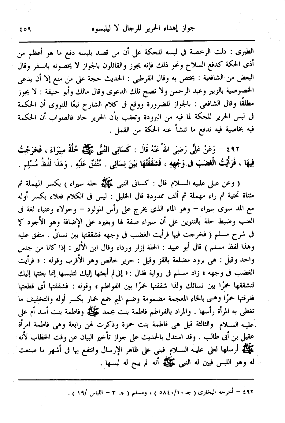 (492) - وَعَنْ عَلِيٍّ - رَضِيَ اللَّهُ عَنْهُ - قَالَ: «كَسَانِي النَّبِيُّ - صَلَّى اللَّهُ عَلَيْهِ وَسَلَّمَ - حُلَّةً سِيَرَاءَ فَخَرَجْتُ فِيهَا فَرَأَيْتُ الْغَضَبَ فِي وَجْهِهِ فَشَقَقْتهَا بَيْنَ نِسَائِي» . مُتَّفَقٌ عَلَيْهِ، وَهَذَا لَفْظُ مُسْلِمٍ