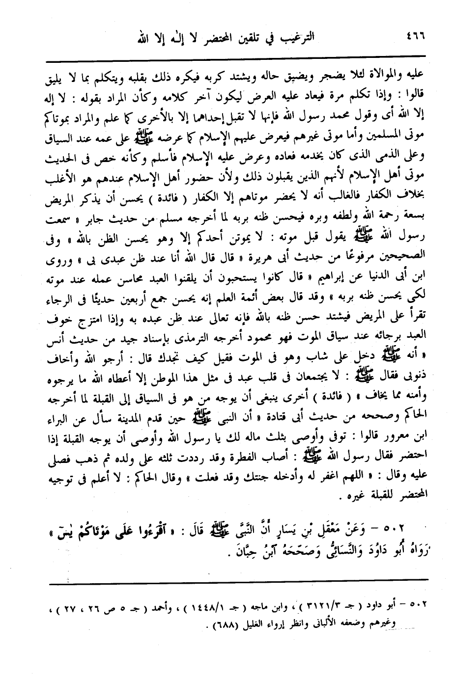 (502) - وَعَنْ مَعْقِلِ بْنِ يَسَارٍ أَنَّ النَّبِيَّ - صَلَّى اللَّهُ عَلَيْهِ وَسَلَّمَ - قَالَ: «اقْرَءُوا عَلَى مَوْتَاكُمْ يس» رَوَاهُ أَبُو دَاوُد وَالنَّسَائِيُّ وَصَحَّحَهُ ابْنُ حِبَّانَ.