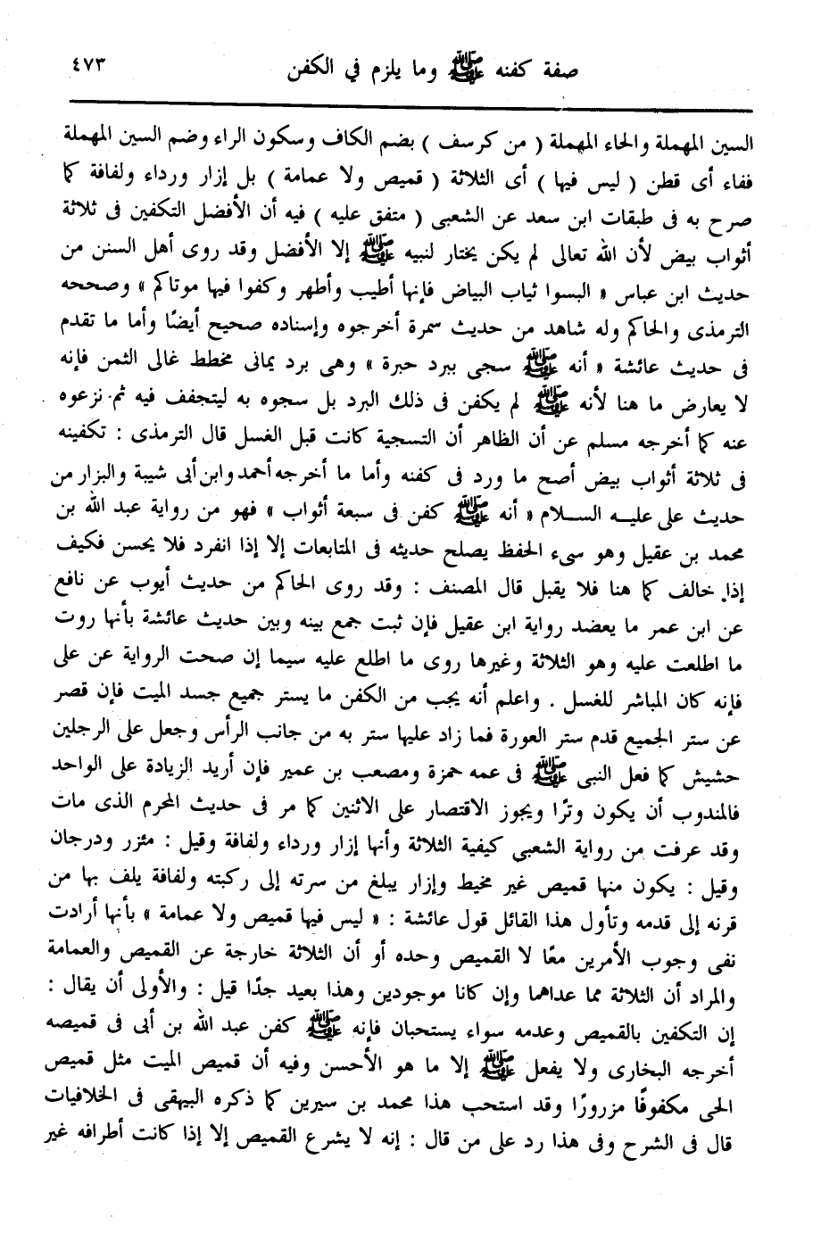 ـــــــــــــــــــــــــــــQالسِّينِ الْمُهْمَلَةِ وَالْحَاءِ الْمُهْمَلَةِ (مِنْ كُرْسُفٍ) بِضَمِّ الْكَافِ وَسُكُونِ الرَّاءِ وَضَمِّ السِّينِ الْمُهْمَلَةِ فَفَاءٌ أَيْ قُطْنٍ (لَيْسَ فِيهَا) أَيْ الثَّلَاثَةِ (قَمِيصٌ وَلَا عِمَامَةٌ) بَلْ إزَارٌ وَرِدَاءٌ وَلِفَافَةٌ كَمَا صَرَّحَ بِهِ فِي طَبَقَاتِ ابْنِ سَعْدٍ عَنْ الشَّعْبِيِّ (مُتَّفَقٌ عَلَيْهِ.