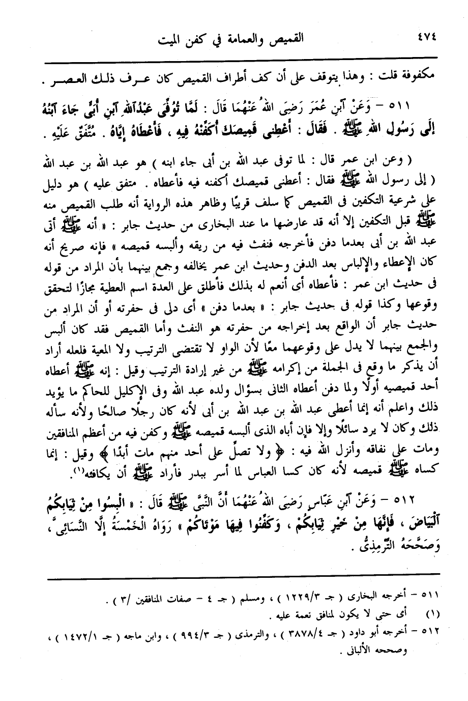 (512) - وَعَنْ ابْنِ عَبَّاسٍ - رَضِيَ اللَّهُ عَنْهُمَا - أَنَّ النَّبِيَّ - صَلَّى اللَّهُ عَلَيْهِ وَسَلَّمَ - قَالَ: «الْبَسُوا مِنْ ثِيَابِكُمْ الْبَيَاضَ، فَإِنَّهَا مِنْ خَيْرِ ثِيَابِكُمْ، وَكَفِّنُوا فِيهَا مَوْتَاكُمْ» رَوَاهُ الْخَمْسَةُ إلَّا النَّسَائِيّ، وَصَحَّحَهُ التِّرْمِذِيُّ.