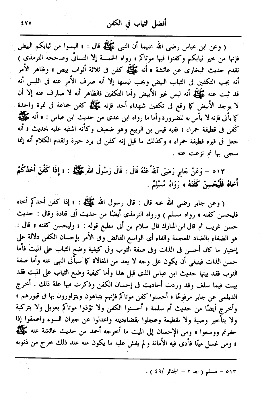 (513) - وَعَنْ جَابِرٍ - رَضِيَ اللَّهُ عَنْهُ - قَالَ: قَالَ رَسُولُ اللَّهِ - صَلَّى اللَّهُ عَلَيْهِ وَسَلَّمَ -: «إذَا كَفَّنَ أَحَدُكُمْ أَخَاهُ فَلْيُحْسِنْ كَفَنَهُ» رَوَاهُ مُسْلِمٌ.