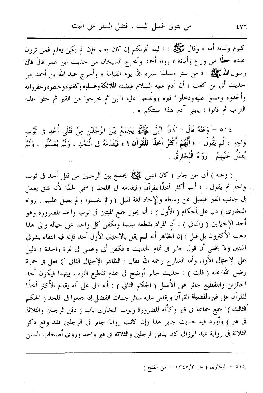 (514) - وَعَنْهُ قَالَ: «كَانَ النَّبِيُّ - صَلَّى اللَّهُ عَلَيْهِ وَسَلَّمَ - يَجْمَعُ بَيْنَ الرَّجُلَيْنِ مِنْ قَتْلَى أُحُدٍ فِي ثَوْبٍ وَاحِدٍ ثُمَّ يَقُولُ: أَيُّهُمْ أَكْثَرُ أَخْذًا لِلْقُرْآنِ؟ فَيُقَدِّمُهُ فِي اللَّحْدِ وَلَمْ يُغَسَّلُوا وَلَمْ يُصَلَّ عَلَيْهِمْ» . رَوَاهُ الْبُخَارِيُّ.