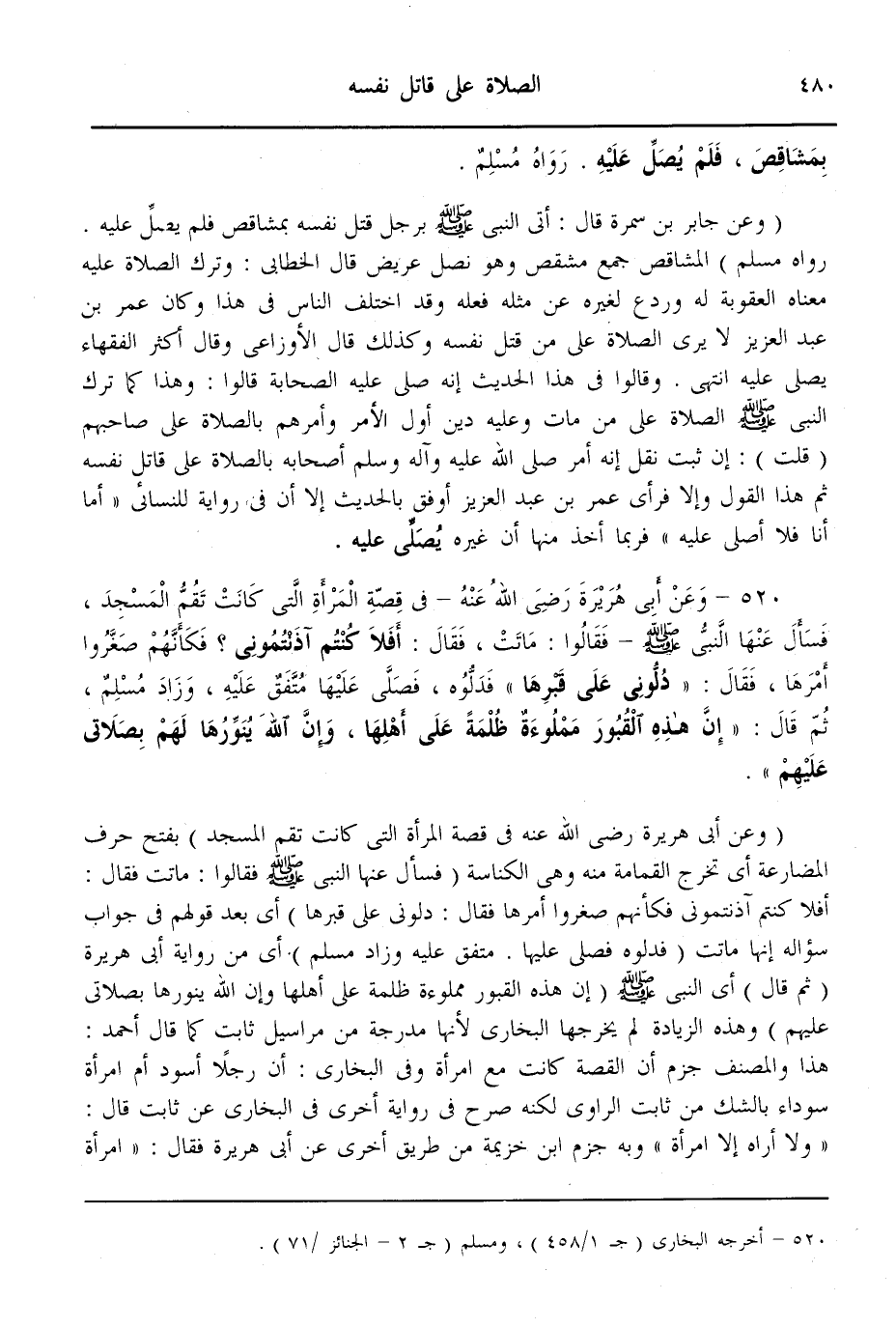 (وَعَنْ جَابِرِ بْنِ سَمُرَةَ قَالَ: «أُتِيَ النَّبِيُّ - صَلَّى اللَّهُ عَلَيْهِ وَسَلَّمَ - بِرَجُلٍ قَتَلَ نَفْسَهُ بِمَشَاقِصَ فَلَمْ يُصَلِّ عَلَيْهِ» . رَوَاهُ مُسْلِمٌ)