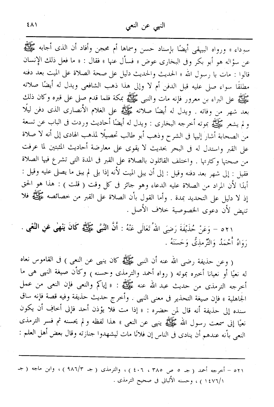 (521) - وَعَنْ حُذَيْفَةَ - رَضِيَ اللَّهُ تَعَالَى عَنْهُ -: «أَنَّ النَّبِيَّ - صَلَّى اللَّهُ عَلَيْهِ وَسَلَّمَ - كَانَ يَنْهَى عَنْ النَّعْيِ.» رَوَاهُ أَحْمَدُ وَالتِّرْمِذِيُّ وَحَسَّنَهُ.