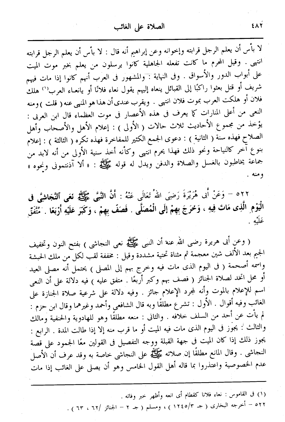 (522) - وَعَنْ أَبِي هُرَيْرَةَ - رَضِيَ اللَّهُ تَعَالَى عَنْهُ -: «أَنَّ النَّبِيَّ - صَلَّى اللَّهُ عَلَيْهِ وَسَلَّمَ - نَعَى النَّجَاشِيَّ فِي الْيَوْمِ الَّذِي مَاتَ فِيهِ، وَخَرَجَ بِهِمْ إلَى الْمُصَلَّى. فَصَفَّ بِهِمْ، وَكَبَّرَ عَلَيْهِ أَرْبَعًا» . مُتَّفَقٌ عَلَيْهِ.