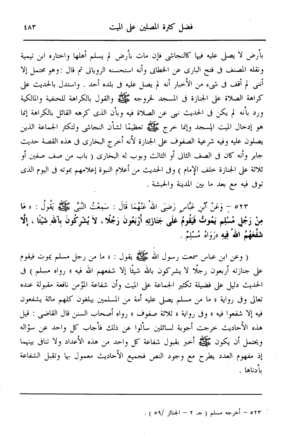(523) - وَعَنْ ابْنِ عَبَّاسٍ - رَضِيَ اللَّهُ عَنْهُمَا - قَالَ: سَمِعْت النَّبِيَّ - صَلَّى اللَّهُ عَلَيْهِ وَسَلَّمَ - يَقُولُ: «مَا مِنْ رَجُلٍ مُسْلِمٍ يَمُوتُ فَيَقُومُ عَلَى جِنَازَتِهِ أَرْبَعُونَ رَجُلًا، لَا يُشْرِكُونَ بِاَللَّهِ شَيْئًا، إلَّا شَفَّعَهُمْ اللَّهُ فِيهِ» رَوَاهُ مُسْلِمٌ.