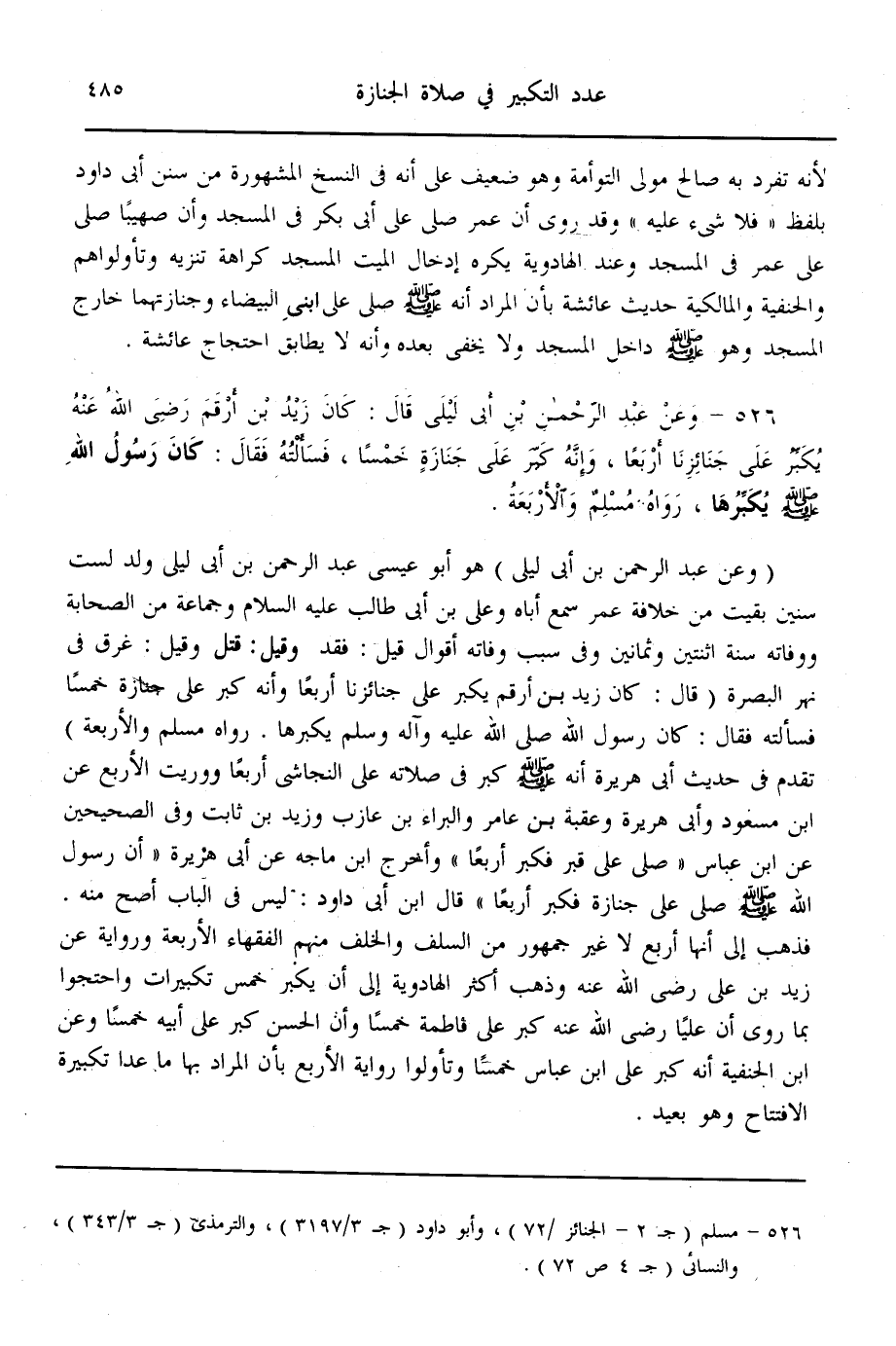 (526) - وَعَنْ عَبْدِ الرَّحْمَنِ بْنِ أَبِي لَيْلَى قَالَ: «كَانَ زَيْدُ بْنُ أَرْقَمَ - رَضِيَ اللَّهُ عَنْهُ - يُكَبِّرُ عَلَى جَنَائِزِنَا أَرْبَعًا، وَأَنَّهُ كَبَّرَ عَلَى جِنَازَةٍ خَمْسًا، فَسَأَلْته فَقَالَ: كَانَ رَسُولُ اللَّهِ - صَلَّى اللَّهُ عَلَيْهِ وَسَلَّمَ - يُكَبِّرُهَا» رَوَاهُ مُسْلِمٌ وَالْأَرْبَعَةُ