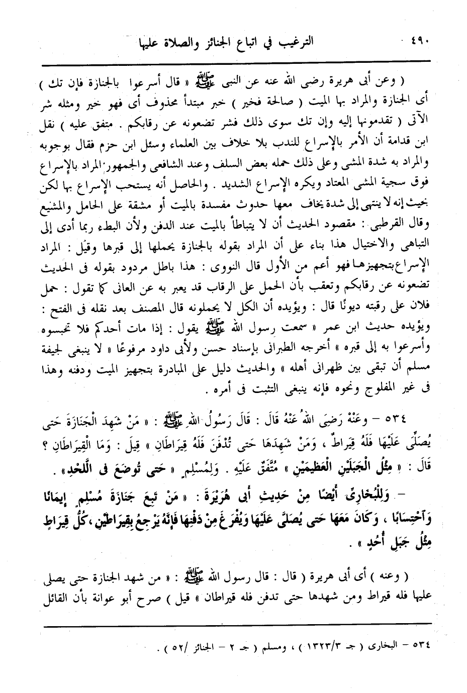(534) - وَعَنْهُ - رَضِيَ اللَّهُ عَنْهُ - قَالَ: قَالَ رَسُولُ اللَّهِ - صَلَّى اللَّهُ عَلَيْهِ وَسَلَّمَ -: «مَنْ شَهِدَ الْجِنَازَةَ حَتَّى يُصَلَّى عَلَيْهَا فَلَهُ قِيرَاطٌ، وَمَنْ شَهِدَهَا حَتَّى تُدْفَنَ فَلَهُ قِيرَاطَانِ قِيلَ: وَمَا الْقِيرَاطَانِ؟ قَالَ: مِثْلُ الْجَبَلَيْنِ الْعَظِيمَيْنِ» مُتَّفَقٌ عَلَيْهِ. وَلِمُسْلِمٍ " حَتَّى تُوضَعَ فِي اللَّحْدِ " - وَلِلْبُخَارِيِّ أَيْضًا مِنْ حَدِيثِ أَبِي هُرَيْرَةَ: «مَنْ تَبِعَ جِنَازَةَ مُسْلِمٍ إيمَانًا وَاحْتِسَابًا، وَكَانَ مَعَهَا حَتَّى يُصَلَّى عَلَيْهَا وَيُفْرَغَ مِنْ دَفْنِهَا فَإِنَّهُ يَرْجِعُ بِقِيرَاطَيْنِ، كُلُّ قِيرَاطٍ مِثْلُ جَبَلِ أُحُدٍ» .