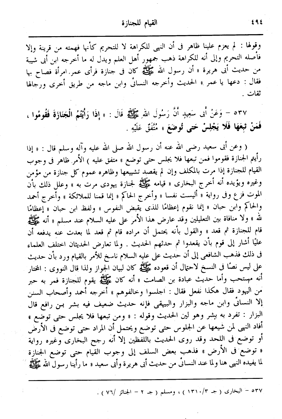 (537) - وَعَنْ أَبِي سَعِيدٍ أَنَّ رَسُولَ اللَّهِ - صَلَّى اللَّهُ عَلَيْهِ وَسَلَّمَ - قَالَ: «إذَا رَأَيْتُمْ الْجِنَازَةَ فَقُومُوا، فَمَنْ تَبِعَهَا فَلَا يَجْلِسْ حَتَّى تُوضَعَ» مُتَّفَقٌ عَلَيْهِ.