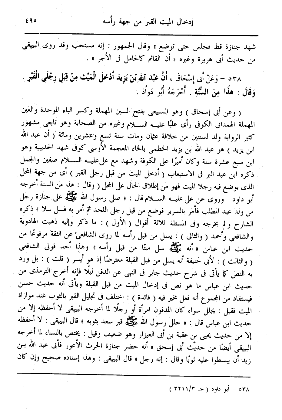 (538) - وَعَنْ أَبِي إِسْحَاقَ، «أَنَّ عَبْدَ اللَّهِ بْنَ يَزِيدَ أَدْخَلَ الْمَيِّتَ مِنْ قِبَلِ رِجْلَيْ الْقَبْرِ. وَقَالَ: هَذَا مِنْ السُّنَّةِ.» أَخْرَجَهُ أَبُو دَاوُد.