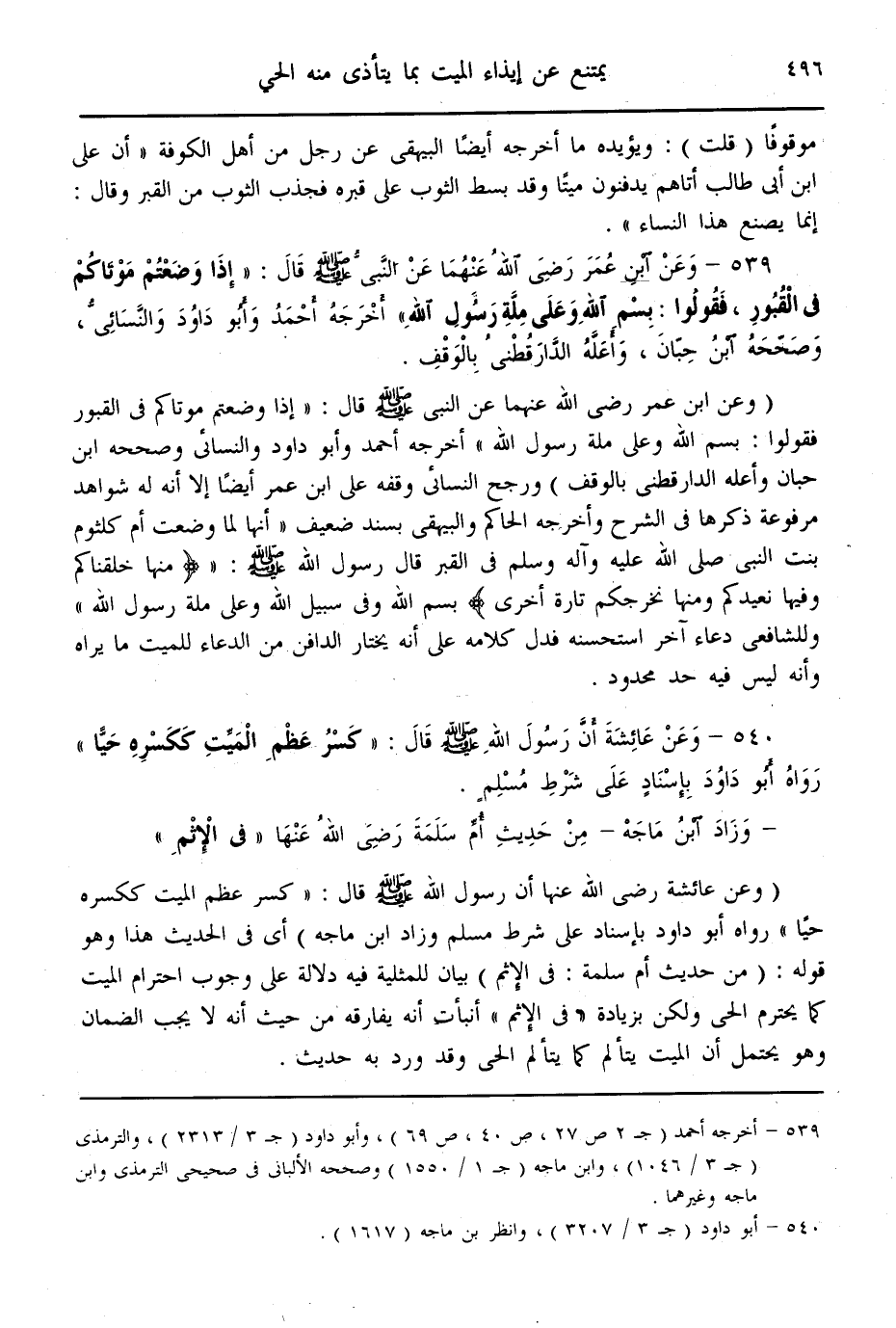 (540) - وَعَنْ عَائِشَةَ أَنَّ رَسُولَ اللَّهِ - صَلَّى اللَّهُ عَلَيْهِ وَسَلَّمَ - قَالَ: «كَسْرُ عَظْمِ الْمَيِّتِ كَكَسْرِهِ حَيًّا» رَوَاهُ أَبُو دَاوُد بِإِسْنَادٍ عَلَى شَرْطِ مُسْلِمٍ - وَزَادَ ابْنُ مَاجَهْ - مِنْ حَدِيثِ أُمِّ سَلَمَةَ - رَضِيَ اللَّهُ عَنْهَا - " فِي الْإِثْمِ "