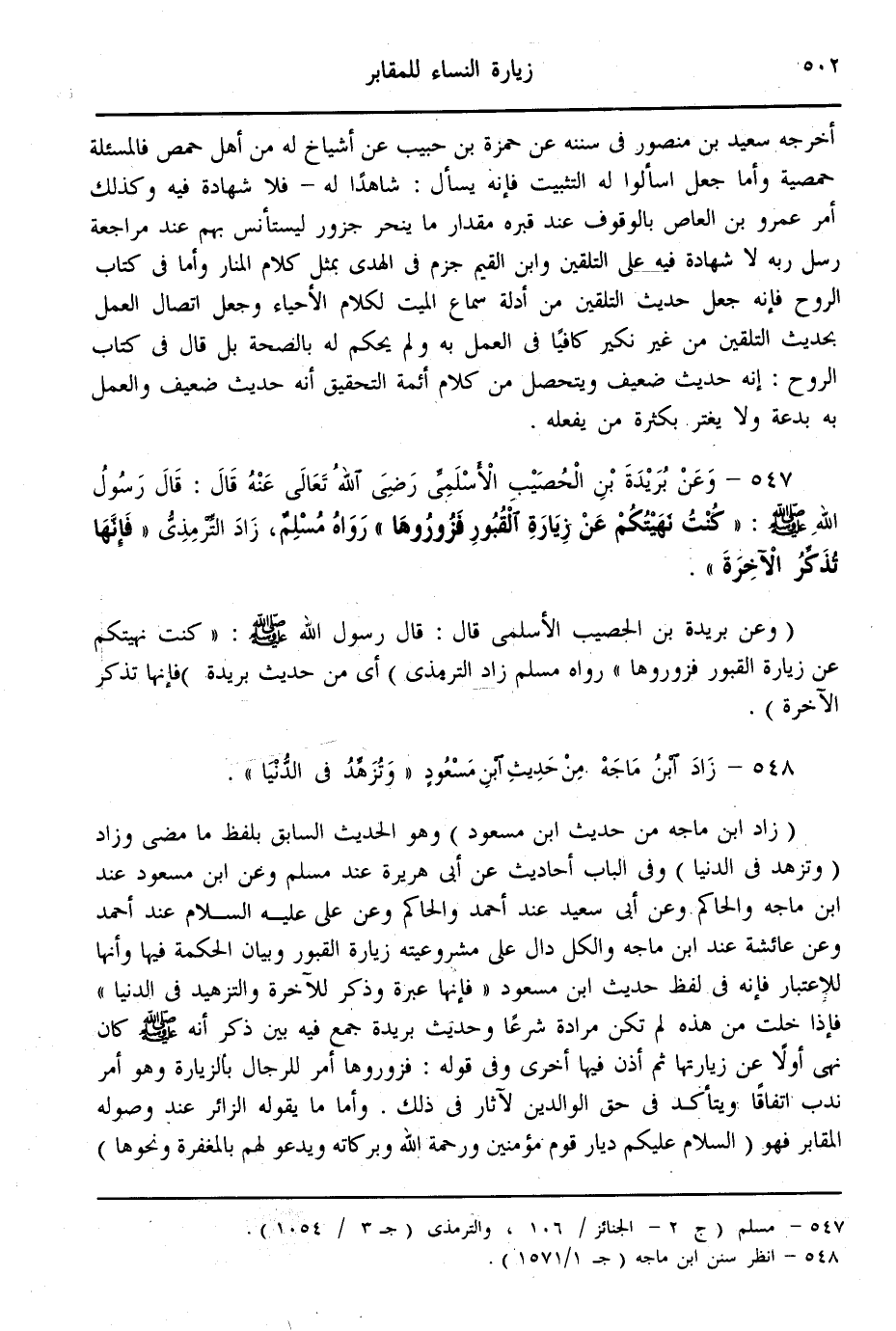 وَالْكُلُّ دَالٌّ عَلَى مَشْرُوعِيَّتِهِ زِيَارَةَ الْقُبُورِ وَبَيَانِ الْحِكْمَةِ فِيهَا وَأَنَّهَا لِلِاعْتِبَارِ فَإِنَّهُ فِي لَفْظِ حَدِيثِ ابْنِ مَسْعُودٍ «فَإِنَّهَا عِبْرَةٌ وَذِكْرٌ لِلْآخِرَةِ وَالتَّزْهِيدِ فِي الدُّنْيَا» فَإِذَا خَلَتْ مِنْ هَذِهِ لَمْ تَكُنْ مُرَادَةً شَرْعًا وَحَدِيثُ بُرَيْدَةَ جَمَعَ فِيهِ بَيْنَ ذِكْرِ أَنَّهُ - صَلَّى اللَّهُ عَلَيْهِ وَسَلَّمَ - كَانَ نَهَى أَوَّلًا عَنْ زِيَارَتِهَا ثُمَّ أَذِنَ فِيهَا أُخْرَى وَفِي قَوْلِهِ: فَزُورُوهَا أَمْرٌ لِلرِّجَالِ بِالزِّيَارَةِ وَهُوَ أَمْرُ نَدْبٍ اتِّفَاقًا وَيَتَأَكَّدُ فِي حَقِّ الْوَالِدَيْنِ لِآثَارٍ فِي ذَلِكَ.