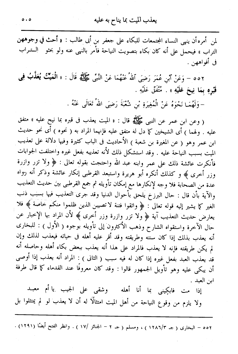 (552) - وَعَنْ ابْنِ عُمَرَ - رَضِيَ اللَّهُ عَنْهُمَا - عَنْ النَّبِيِّ - صَلَّى اللَّهُ عَلَيْهِ وَسَلَّمَ - قَالَ: «الْمَيِّتُ يُعَذَّبُ فِي قَبْرِهِ بِمَا نِيحَ عَلَيْهِ» . مُتَّفَقٌ عَلَيْهِ - وَلَهُمَا نَحْوُهُ عَنْ الْمُغِيرَةِ بْنِ شُعْبَةَ - رَضِيَ اللَّهُ تَعَالَى عَنْهُ -.