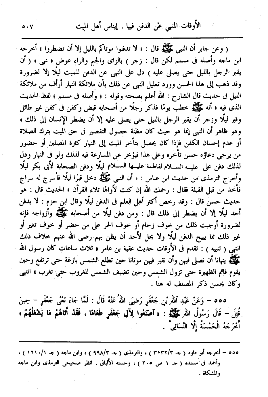 (555) - وَعَنْ عَبْدِ اللَّهِ بْنِ جَعْفَرٍ - رَضِيَ اللَّهُ عَنْهُ - قَالَ: «لَمَّا جَاءَ نَعْيُ جَعْفَرٍ - حِينَ قُتِلَ - قَالَ رَسُولُ اللَّهِ - صَلَّى اللَّهُ عَلَيْهِ وَسَلَّمَ -: اصْنَعُوا لِآلِ جَعْفَرٍ طَعَامًا، فَقَدْ أَتَاهُمْ مَا يَشْغَلُهُمْ» أَخْرَجَهُ الْخَمْسَةُ إلَّا النَّسَائِيّ.