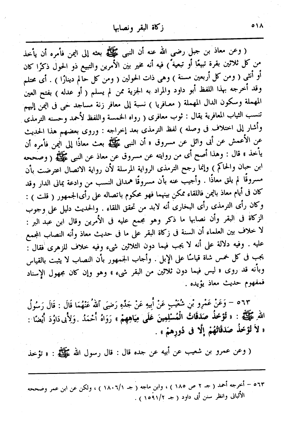 (563) - وَعَنْ عَمْرِو بْنِ شُعَيْبٍ عَنْ أَبِيهِ عَنْ جَدِّهِ - رَضِيَ اللَّهُ عَنْهُمَا - قَالَ: قَالَ رَسُولُ اللَّهِ - صَلَّى اللَّهُ عَلَيْهِ وَسَلَّمَ -: «تُؤْخَذُ صَدَقَاتُ الْمُسْلِمِينَ عَلَى مِيَاهِهِمْ» رَوَاهُ أَحْمَدُ.
