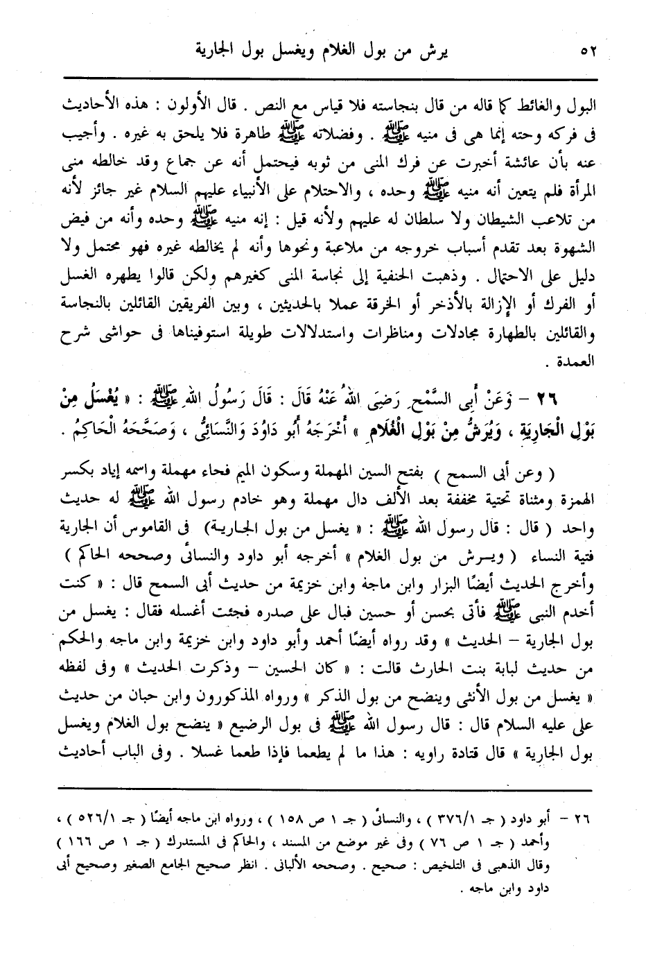 (26) - وَعَنْ أَبِي السَّمْحِ - رَضِيَ اللَّهُ عَنْهُ - قَالَ: قَالَ رَسُولُ اللَّهِ - صَلَّى اللَّهُ عَلَيْهِ وَسَلَّمَ - «يُغْسَلُ مِنْ بَوْلِ الْجَارِيَةِ، وَيُرَشُّ مِنْ بَوْلِ الْغُلَامِ» أَخْرَجَهُ أَبُو دَاوُد وَالنَّسَائِيُّ، وَصَحَّحَهُ الْحَاكِمُ.