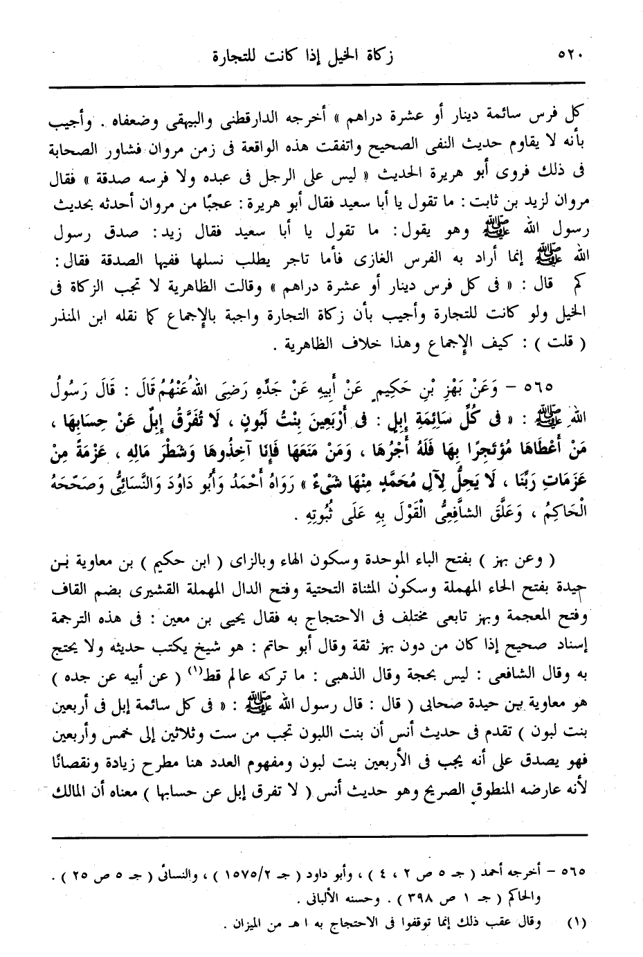 (565) - وَعَنْ بَهْزِ بْنِ حَكِيمٍ عَنْ أَبِيهِ عَنْ جَدِّهِ - رَضِيَ اللَّهُ عَنْهُمْ - قَالَ: قَالَ رَسُولُ اللَّهِ - صَلَّى اللَّهُ عَلَيْهِ وَسَلَّمَ -: «فِي كُلِّ سَائِمَةِ إبِلٍ: فِي أَرْبَعِينَ بِنْتُ لَبُونٍ، لَا تُفَرَّقُ إبِلٌ عَنْ حِسَابِهَا، مَنْ أَعْطَاهَا مُؤْتَجِرًا بِهَا فَلَهُ أَجْرُهَا، وَمَنْ مَنَعَهَا فَإِنَّا آخِذُوهَا وَشَطْرَ مَالِهِ، عَزْمَةً مِنْ عَزَمَاتِ رَبِّنَا، لَا يَحِلُّ لِآلِ مُحَمَّدٍ مِنْهَا شَيْءٌ» رَوَاهُ أَحْمَدُ وَأَبُو دَاوُد وَالنَّسَائِيُّ وَصَحَّحَهُ الْحَاكِمُ، وَعَلَّقَ الشَّافِعِيُّ الْقَوْلَ بِهِ عَلَى ثُبُوتِهِ.