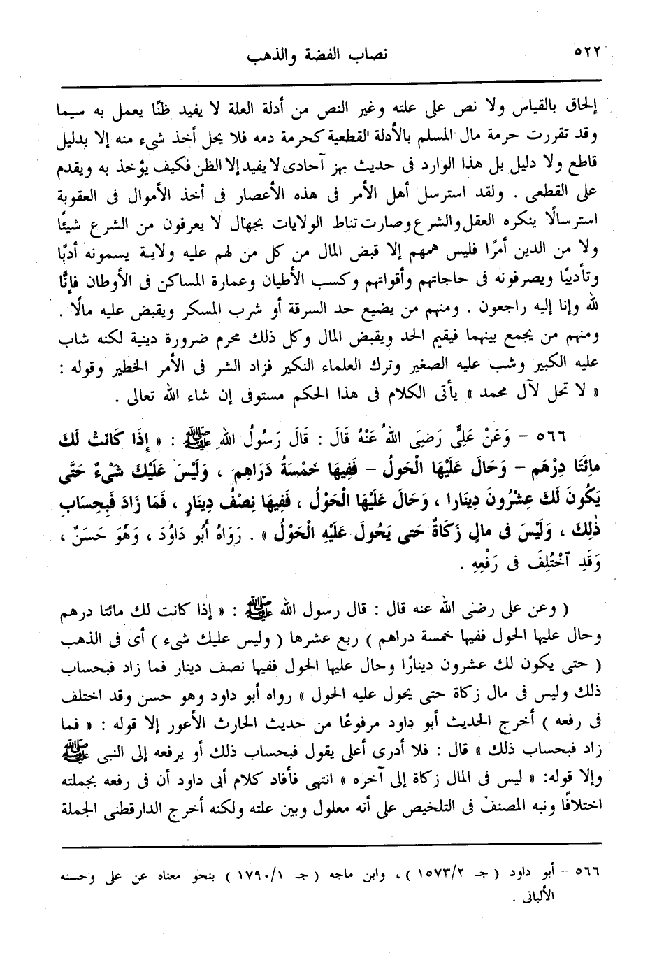 (566) - وَعَنْ عَلِيٍّ - رَضِيَ اللَّهُ عَنْهُ - قَالَ: قَالَ رَسُولُ اللَّهِ - صَلَّى اللَّهُ عَلَيْهِ وَسَلَّمَ -: «إذَا كَانَتْ لَك مِائَتَا دِرْهَمٍ - وَحَالَ عَلَيْهَا الْحَوْلُ - فَفِيهَا خَمْسَةُ دَرَاهِمَ، وَلَيْسَ عَلَيْك شَيْءٌ حَتَّى يَكُونَ لَك عِشْرُونَ دِينَارًا، وَحَالَ عَلَيْهَا الْحَوْلُ، فَفِيهَا نِصْفُ دِينَارٍ، فَمَا زَادَ فَبِحِسَابِ ذَلِكَ، وَلَيْسَ فِي مَالِ زَكَاةٍ حَتَّى يَحُولَ عَلَيْهِ الْحَوْلُ» . رَوَاهُ أَبُو دَاوُد، وَهُوَ حَسَنٌ، وَقَدْ اُخْتُلِفَ فِي رَفْعِهِ