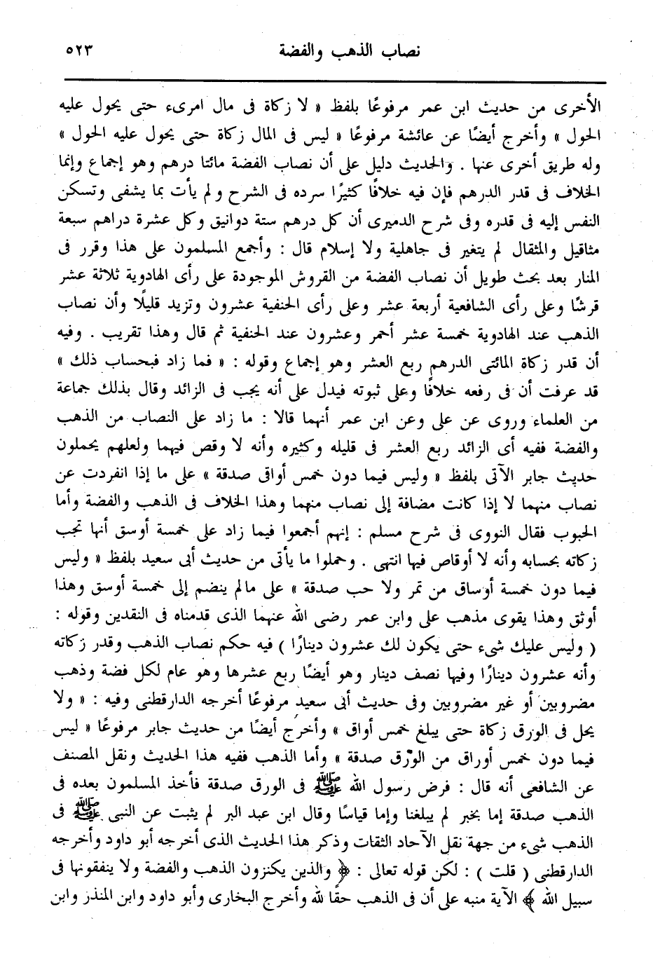وَحَمَلُوا مَا يَأْتِي مِنْ حَدِيثِ أَبِي سَعِيدٍ بِلَفْظِ «وَلَيْسَ فِيمَا دُونَ خَمْسَةِ أَوْسَاقٍ مِنْ تَمْرٍ وَلَا حَبٍّ صَدَقَةٌ» عَلَى مَا لَمْ يَنْضَمَّ إلَى خَمْسَةِ أَوْسُقٍ وَهَذَا أَوْثَقُ وَهَذَا يُقَوِّي مَذْهَبَ عَلِيٍّ وَابْنِ عُمَرَ - رَضِيَ اللَّهُ عَنْهُمَا - الَّذِي قَدَّمْنَاهُ فِي النَّقْدَيْنِ وَقَوْلُهُ: (وَلَيْسَ عَلَيْك شَيْءٌ حَتَّى يَكُونَ لَك عِشْرُونَ دِينَارًا) فِيهِ حُكْمُ نِصَابِ الذَّهَبِ وَقَدْرُ زَكَاتِهِ وَأَنَّهُ عِشْرُونَ دِينَارًا وَفِيهَا نِصْفُ دِينَارٍ وَهُوَ أَيْضًا رُبُعُ عُشْرِهَا وَهُوَ عَامٌّ لِكُلِّ فِضَّةٍ وَذَهَبٍ مَضْرُوبَيْنِ أَوْ غَيْرَ مَضْرُوبَيْنِ.