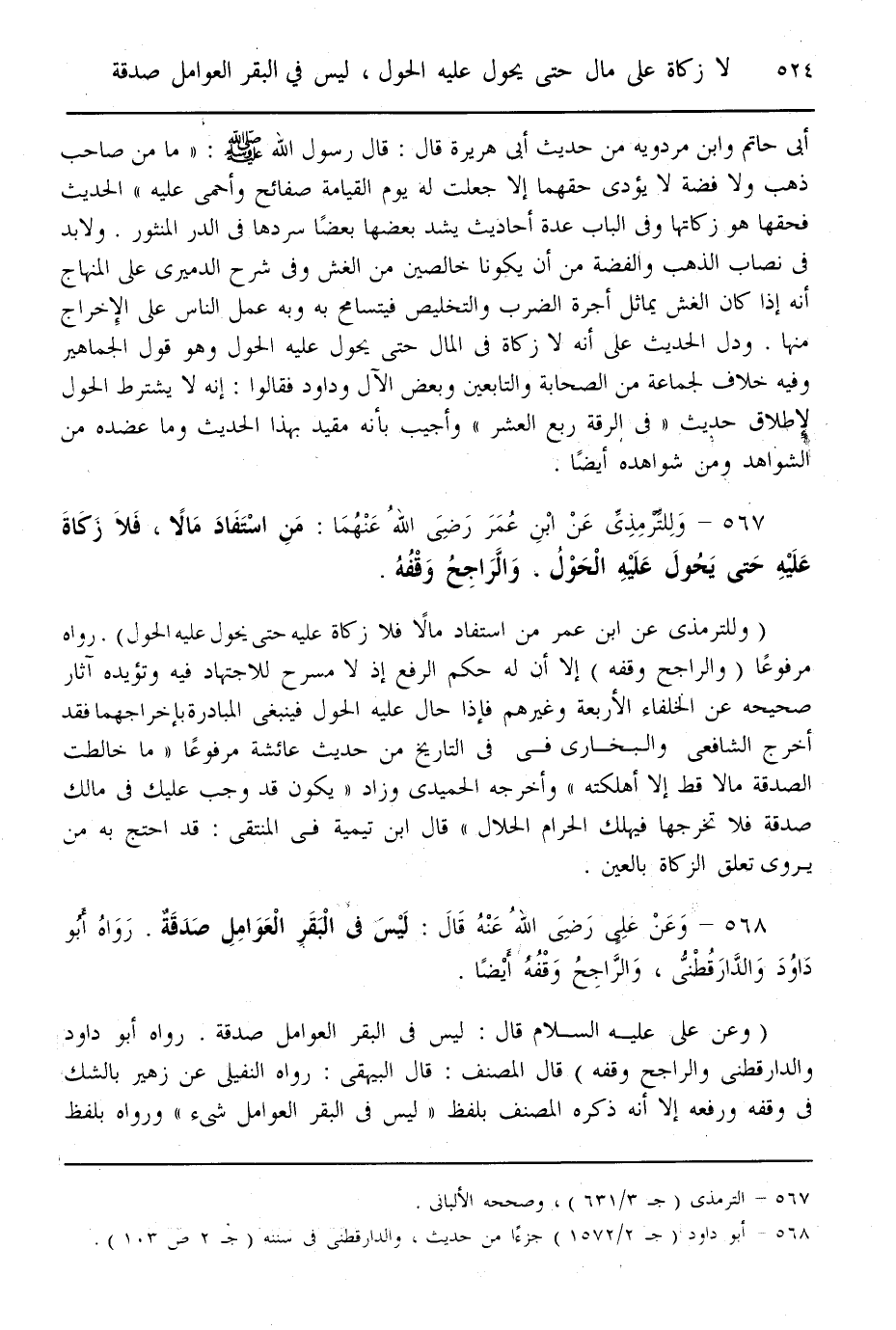 (568) - وَعَنْ عَلِيٍّ - رَضِيَ اللَّهُ عَنْهُ - قَالَ: لَيْسَ فِي الْبَقَرِ الْعَوَامِلِ صَدَقَةٌ. رَوَاهُ أَبُو دَاوُد وَالدَّارَقُطْنِيّ، وَالرَّاجِحُ وَقْفُهُ أَيْضًا
