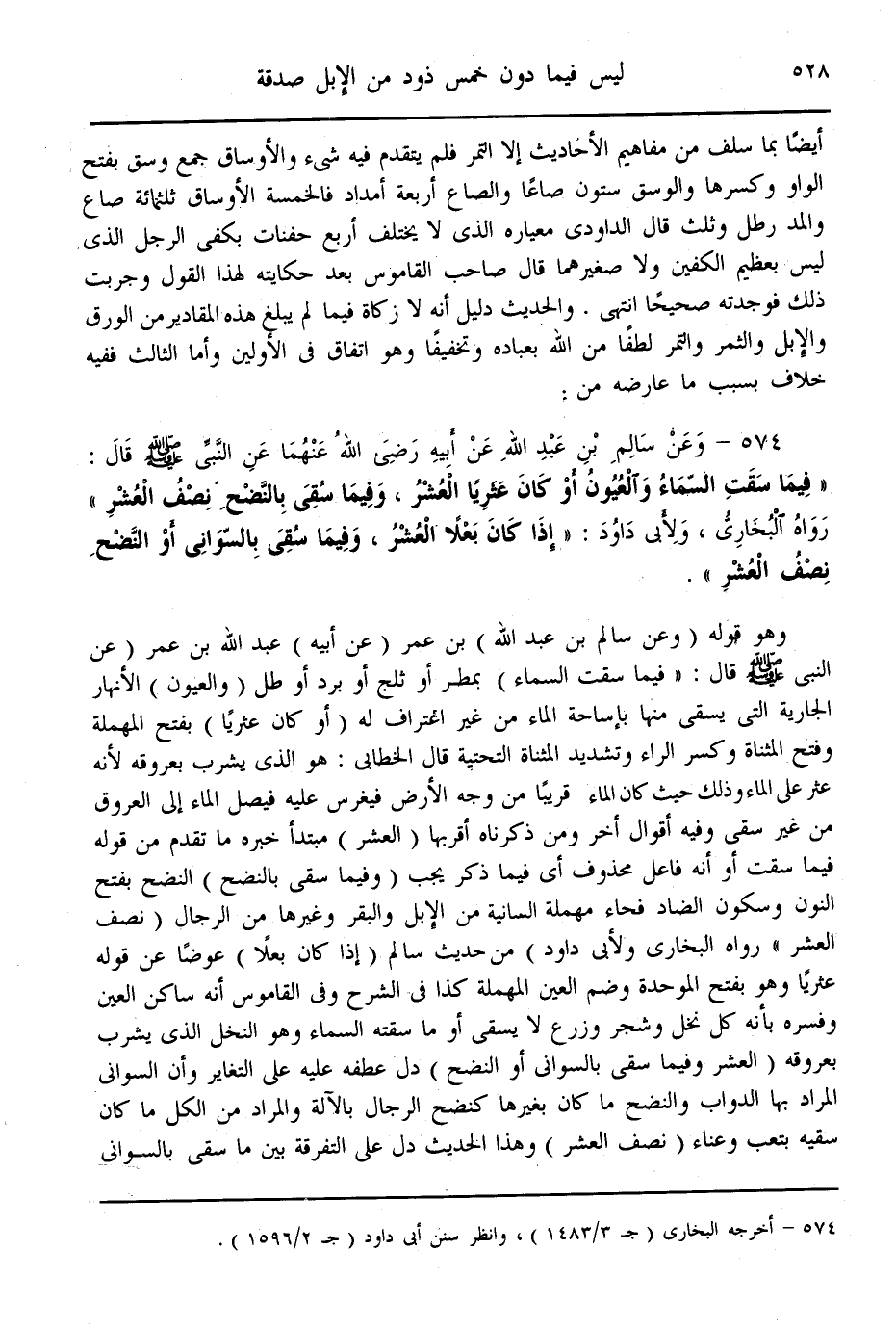 (574) - وَعَنْ سَالِمِ بْنِ عَبْدِ اللَّهِ عَنْ أَبِيهِ - رَضِيَ اللَّهُ عَنْهُمَا - عَنْ النَّبِيِّ - صَلَّى اللَّهُ عَلَيْهِ وَسَلَّمَ - قَالَ: «فِيمَا سَقَتْ السَّمَاءُ وَالْعُيُونُ أَوْ كَانَ عَثَرِيًّا الْعُشْرُ، وَفِيمَا سُقِيَ بِالنَّضْحِ نِصْفُ الْعُشْرِ» رَوَاهُ الْبُخَارِيُّ، وَلِأَبِي دَاوُد: «إذَا كَانَ بَعْلًا الْعُشْرُ، وَفِيمَا سُقِيَ بِالسَّوَانِي أَوْ النَّضْحِ نِصْفُ الْعُشْرِ» .