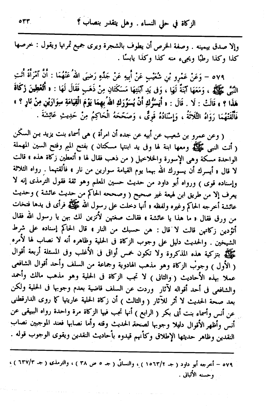 (579) - وَعَنْ عَمْرِو بْنِ شُعَيْبٍ عَنْ أَبِيهِ عَنْ جَدِّهِ - رَضِيَ اللَّهُ عَنْهُمَا -: «أَنَّ امْرَأَةً أَتَتْ النَّبِيَّ - صَلَّى اللَّهُ عَلَيْهِ وَسَلَّمَ -، وَمَعَهَا ابْنَةٌ لَهَا، وَفِي يَدِ ابْنَتِهَا مَسَكَتَانِ مِنْ ذَهَبٍ فَقَالَ لَهَا: أَتُعْطِينَ زَكَاةَ هَذَا؟ قَالَتْ: لَا. قَالَ: أَيَسُرُّك أَنْ يُسَوِّرَك اللَّهُ بِهِمَا يَوْمَ الْقِيَامَةِ سِوَارَيْنِ مِنْ نَارٍ؟ فَأَلْقَتْهُمَا» رَوَاهُ الثَّلَاثَةُ، وَإِسْنَادُهُ قَوِيٌّ، وَصَحَّحَهُ الْحَاكِمُ مِنْ حَدِيثِ عَائِشَةَ