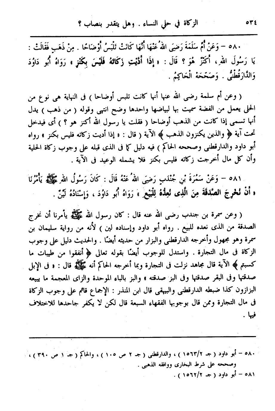 (580) - «وَعَنْ أُمِّ سَلَمَةَ - رَضِيَ اللَّهُ عَنْهَا - أَنَّهَا كَانَتْ تَلْبَسُ أَوْضَاحًا، مِنْ ذَهَبٍ فَقَالَتْ: يَا رَسُولَ اللَّهِ، أَكَنْزٌ هُوَ؟ قَالَ: إذَا أَدَّيْت زَكَاتَهُ فَلَيْسَ بِكَنْزٍ» رَوَاهُ أَبُو دَاوُد وَالدَّارَقُطْنِيّ. وَصَحَّحَهُ الْحَاكِمُ