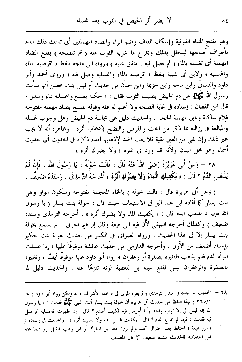 (28) - وَعَنْ أَبِي هُرَيْرَةَ - رَضِيَ اللَّهُ عَنْهُ - قَالَ: «قَالَتْ خَوْلَةُ: يَا رَسُولَ اللَّهِ، فَإِنْ لَمْ يَذْهَبْ الدَّمُ؟ قَالَ: يَكْفِيك الْمَاءُ وَلَا يَضُرُّك أَثَرُهُ» أَخْرَجَهُ التِّرْمِذِيُّ. وَسَنَدُهُ ضَعِيفٌ.