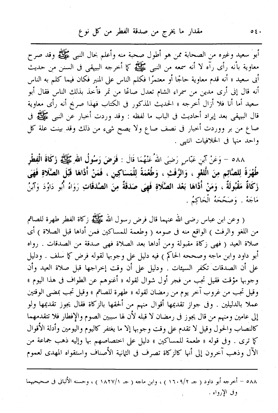 (588) - وَعَنْ ابْنِ عَبَّاسٍ - رَضِيَ اللَّهُ عَنْهُمَا - قَالَ: «فَرَضَ رَسُولُ اللَّهِ - صَلَّى اللَّهُ عَلَيْهِ وَسَلَّمَ - زَكَاةَ الْفِطْرِ طُهْرَةً لِلصَّائِمِ مِنْ اللَّغْوِ، وَالرَّفَثِ، وَطُعْمَةً لِلْمَسَاكِينِ، فَمَنْ أَدَّاهَا قَبْلَ الصَّلَاةِ فَهِيَ زَكَاةٌ مَقْبُولَةٌ، وَمَنْ أَدَّاهَا بَعْدَ الصَّلَاةِ فَهِيَ صَدَقَةٌ مِنْ الصَّدَقَاتِ» رَوَاهُ أَبُو دَاوُد وَابْنُ مَاجَهْ. وَصَحَّحَهُ الْحَاكِمُ