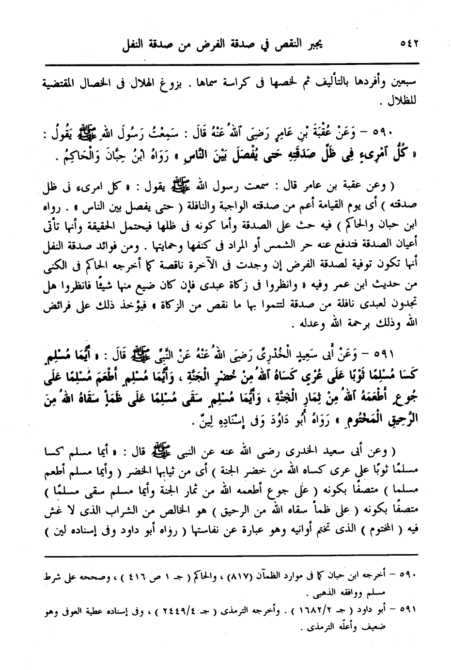 (590) - وَعَنْ عُقْبَةَ بْنِ عَامِرٍ - رَضِيَ اللَّهُ عَنْهُ - قَالَ: سَمِعْت رَسُولَ اللَّهِ - صَلَّى اللَّهُ عَلَيْهِ وَسَلَّمَ - يَقُولُ: «كُلُّ امْرِئٍ فِي ظِلِّ صَدَقَتِهِ حَتَّى يُفْصَلَ بَيْنَ النَّاسِ» رَوَاهُ ابْنُ حِبَّانَ وَالْحَاكِمُ