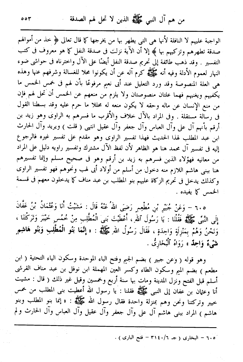 (قُلْت) وَيُرِيدُ وَآلُ الْحَارِثِ بْنِ عَبْدِ الْمُطَّلِبِ لِهَذَا الْحَدِيثِ فَهَذَا تَفْسِيرُ الرَّاوِي وَهُوَ مُقَدَّمٌ عَلَى تَفْسِيرِ غَيْرِهِ فَالرُّجُوعُ إلَيْهِ فِي تَفْسِيرِ آلِ مُحَمَّدٍ هُنَا هُوَ الظَّاهِرُ؛ لِأَنَّ لَفْظَ الْآلِ مُشْتَرَكٌ وَتَفْسِيرُ رَاوِيهِ دَلِيلٌ عَلَى الْمُرَادِ مِنْ مَعَانِيهِ؛ فَهَؤُلَاءِ الَّذِينَ فَسَرَّهُمْ بِهِ زَيْدُ بْنُ أَرْقَمَ وَهُوَ فِي صَحِيحِ مُسْلِمٍ وَإِنَّمَا تَفْسِيرُهُمْ هُنَا بِبَنِي هَاشِمٍ اللَّازِمُ مِنْهُ دُخُولُ مَنْ أَسْلَمَ مِنْ أَوْلَادِ أَبِي لَهَبٍ وَنَحْوِهِمْ فَهُوَ تَفْسِيرُ الرَّاوِي وَكَذَلِكَ يَدْخُلُ فِي تَحْرِيمِ الزَّكَاةِ عَلَيْهِمْ بَنُو الْمُطَّلِبِ بْنُ عَبْدِ مَنَافٍ كَمَا يَدْخُلُونَ مَعَهُمْ فِي قِسْمَةِ الْخُمُسِ كَمَا يُفِيدُهُ.